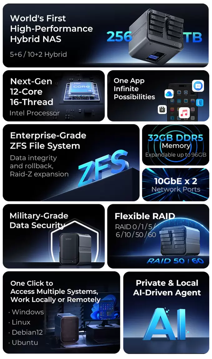 软件方面,内置ZFS企业级文件系统,充分保障数据安全;自研的本地化智慧操作系统赛博云空间(CyberData OS),深度融入AI技术,优化检索、分类等功能,帮助用户轻松打造本地AI相册、搭建4K无损影音中心。