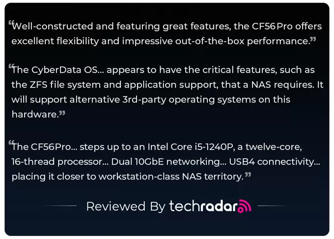 专业科技媒体TechRadar在测评中给予了高度评价:“(CyberData系列中的)CF56Pro设计精良,功能强大,展现了出色的灵活性和令人印象深刻的实用性能,是工作站级别的NAS。”