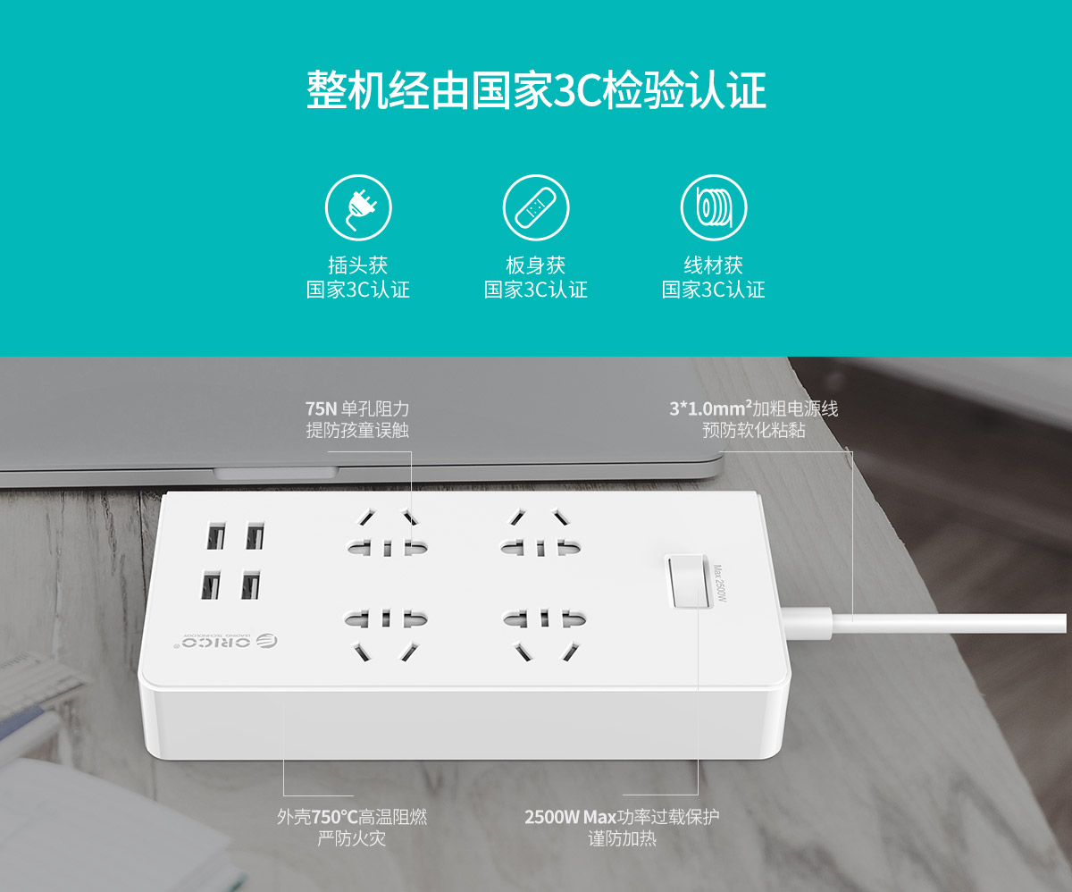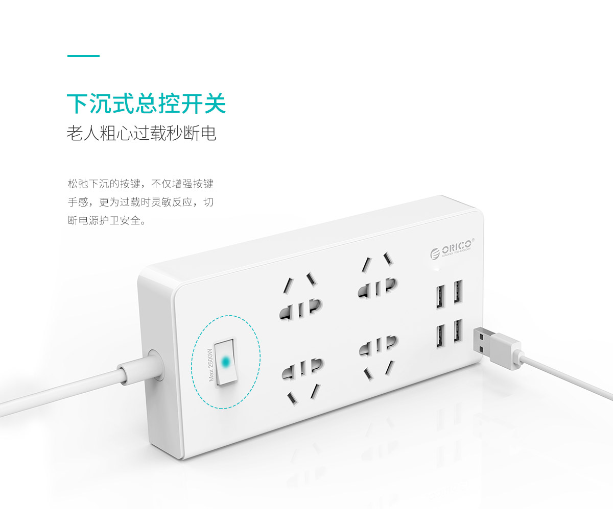 新国标便携桌面式排插,独立开关,2500W大功率