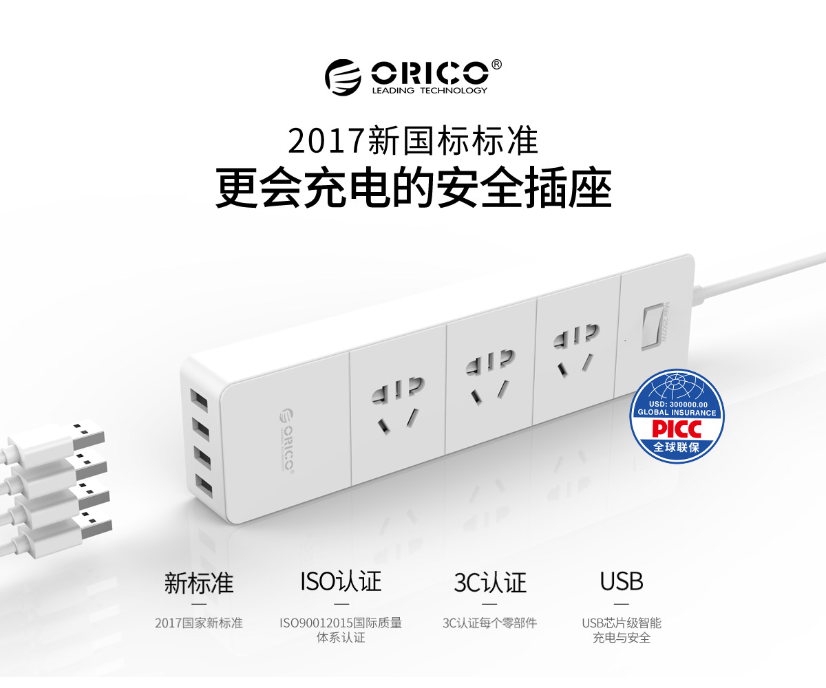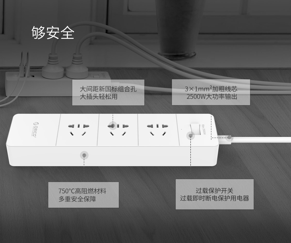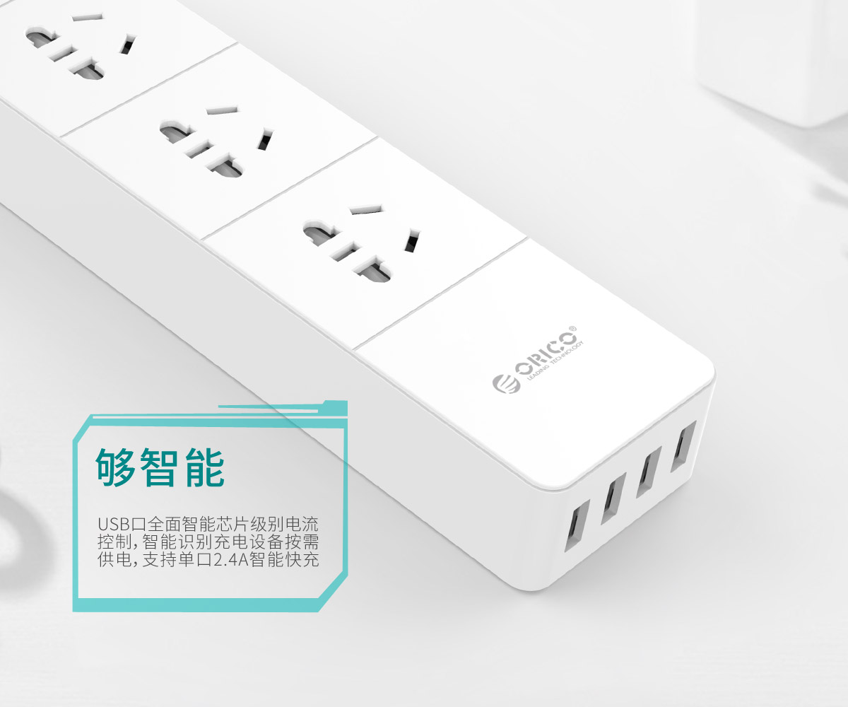 便携桌面式排插 4口USB+3A接口 750℃耐高温 单口支持2.4A