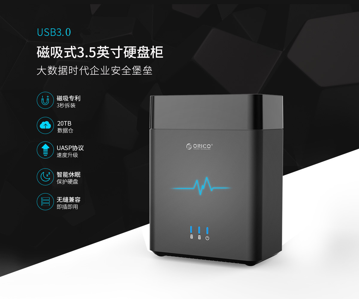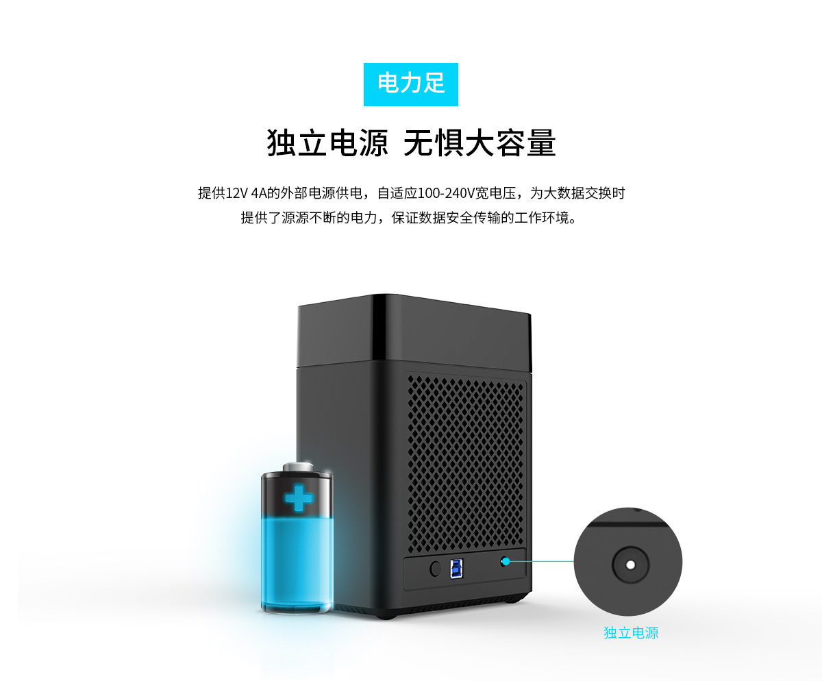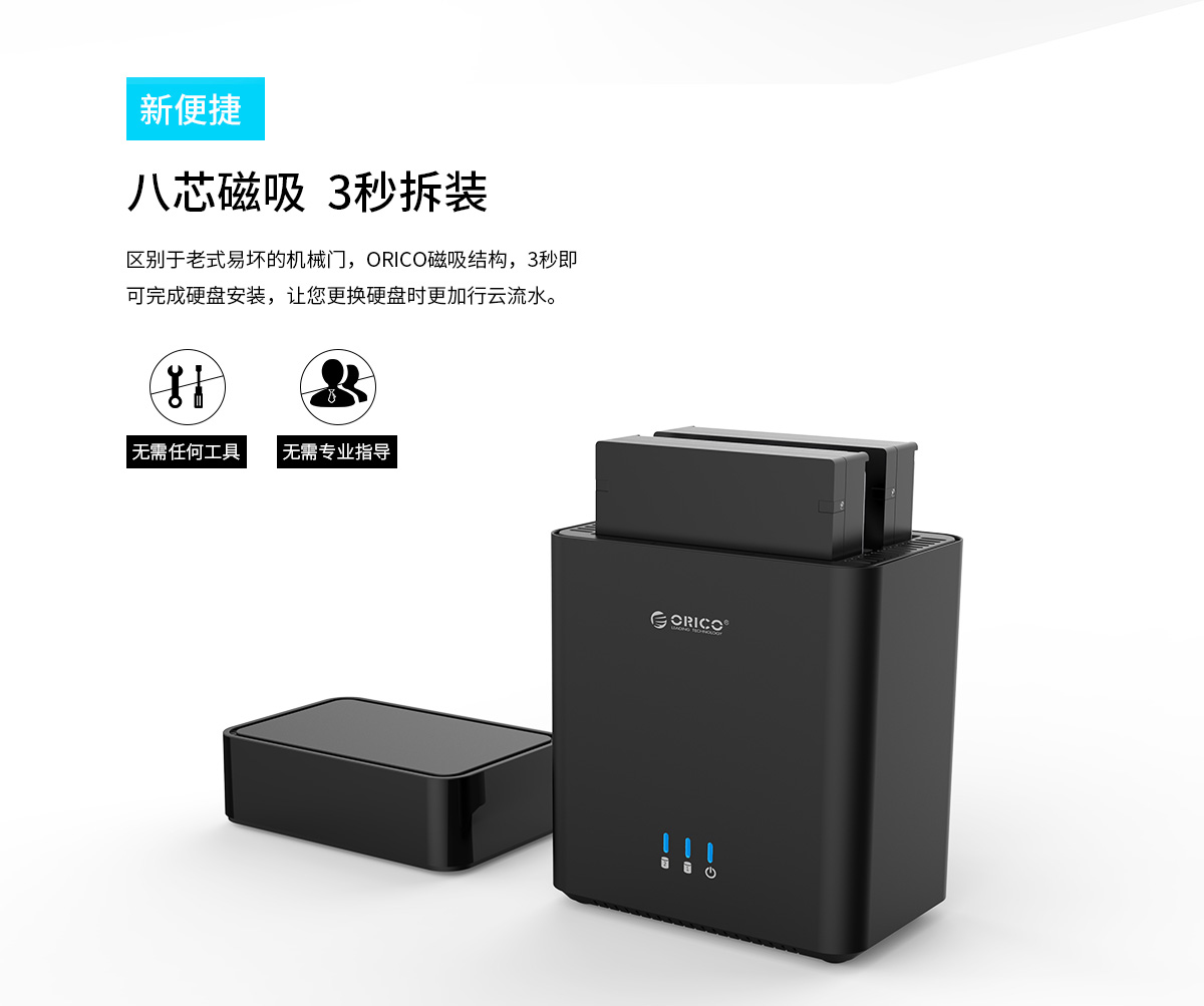 八芯磁吸,3秒拆装,单盘支持10TB,即插即用,智能休眠,节能环保,静音风扇及蜂窝孔散热,支持UASP协议。