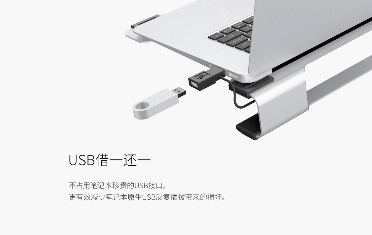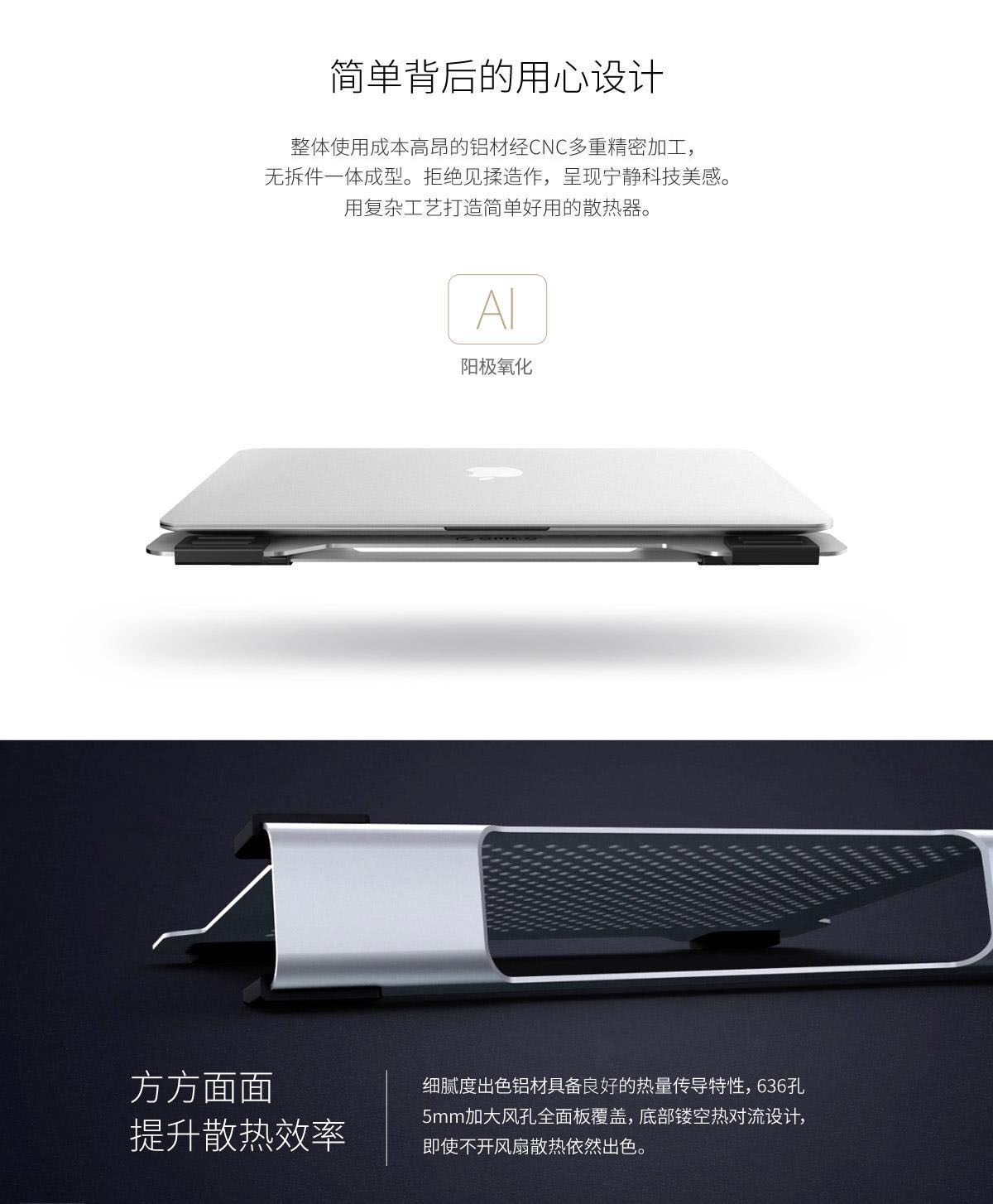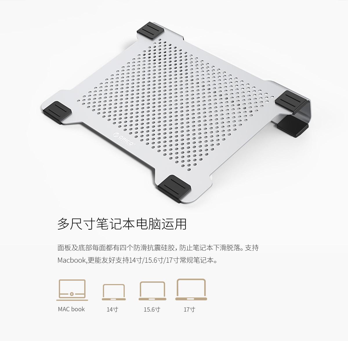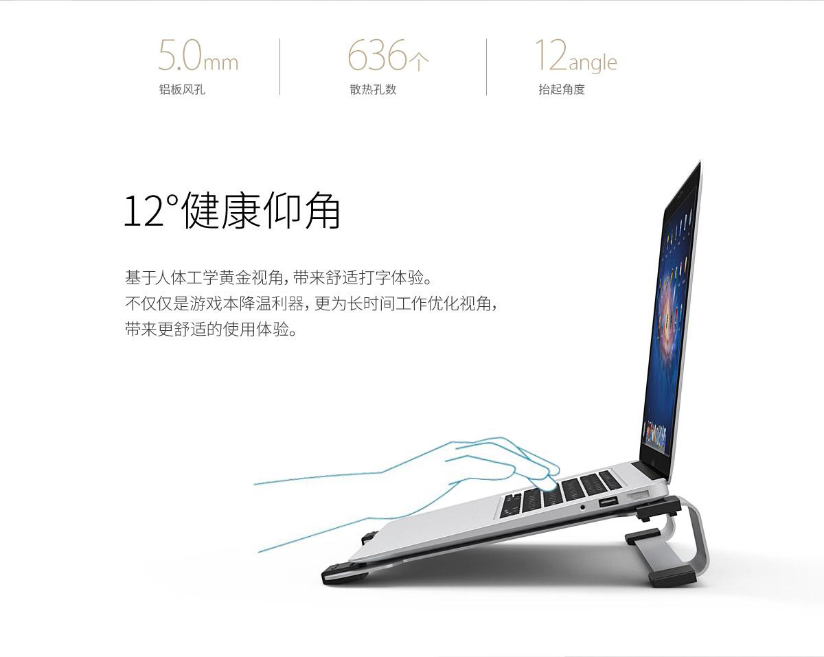 5mm铝板风孔,12度仰角设计,USB借一还一,防滑硅胶垫,多尺寸适用