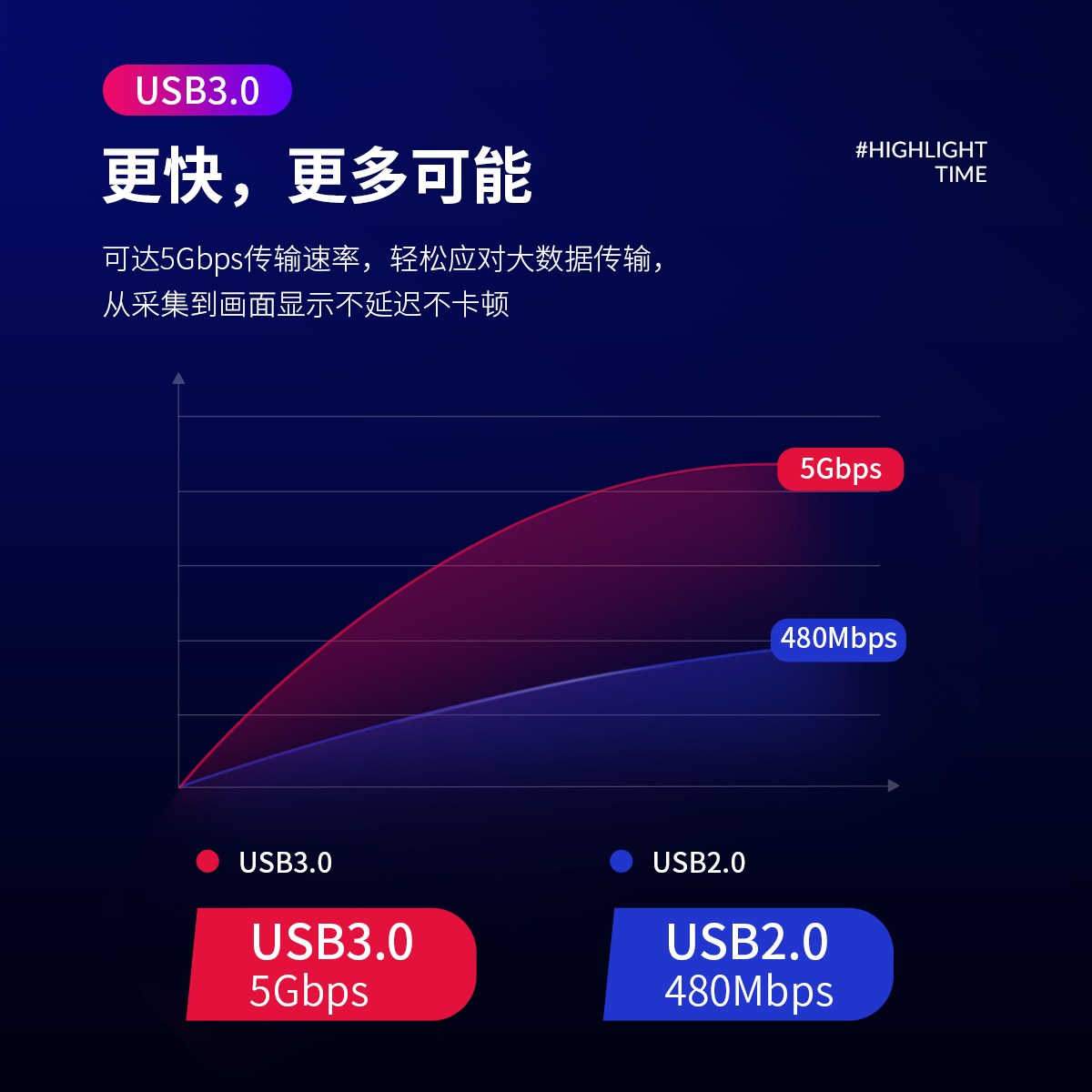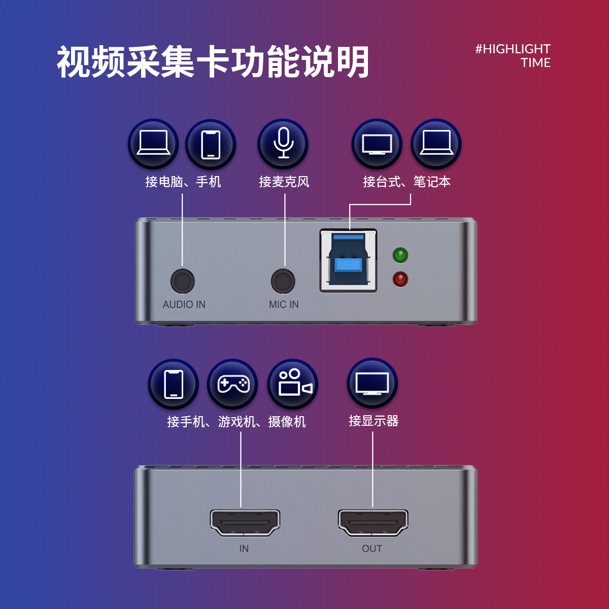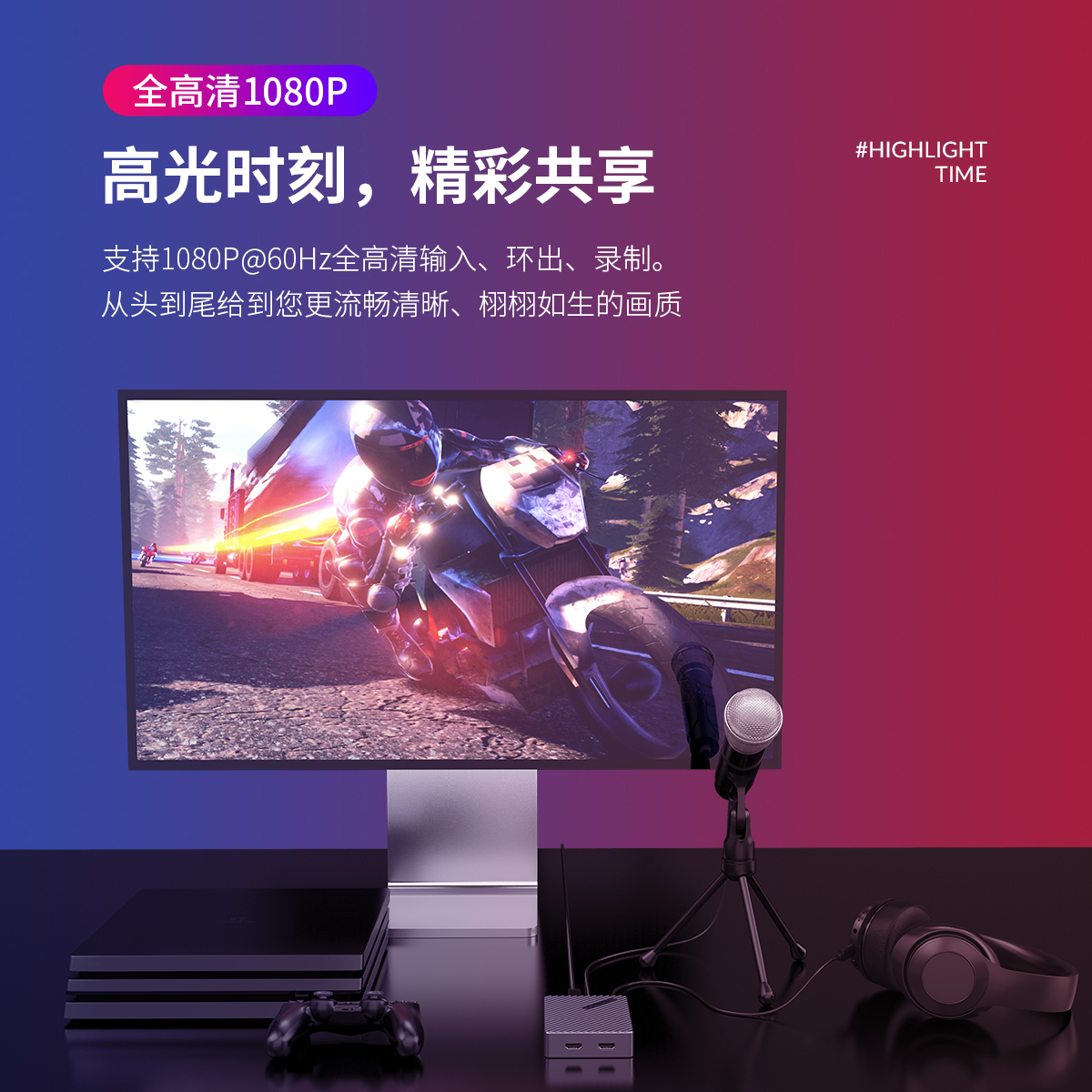HDMI转USB3.0采集卡,支持1080P@60Hz全高清输入、环出、录制,支持麦克风输入和背景音乐输入, 外壳主体由品质铝合金打造,免驱动设计,兼容多个设备、多种系统,