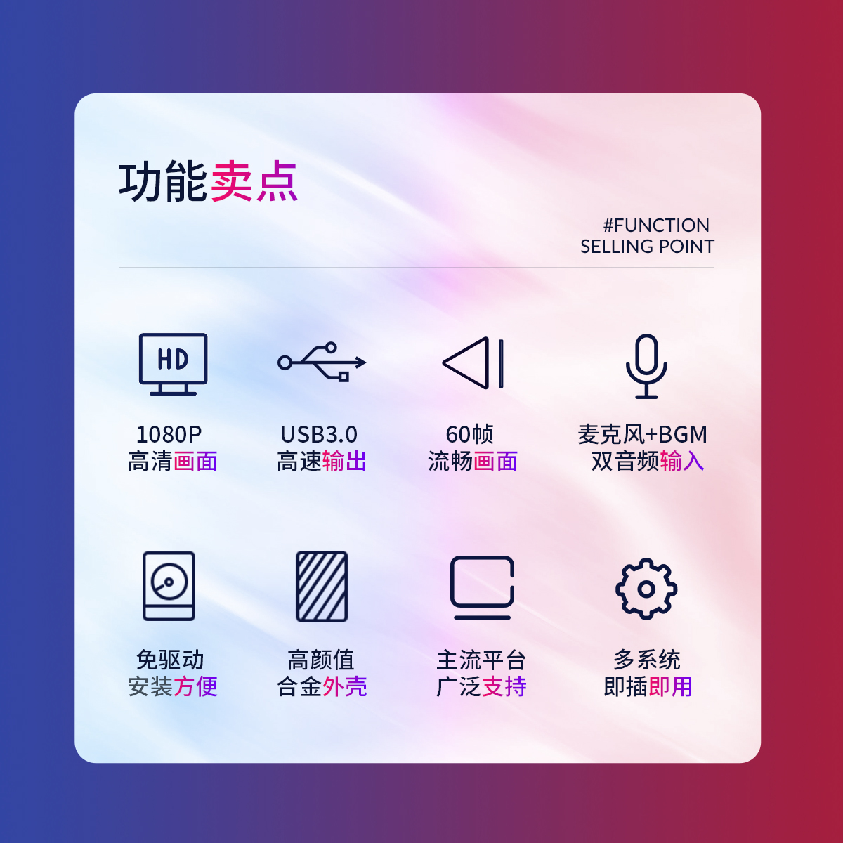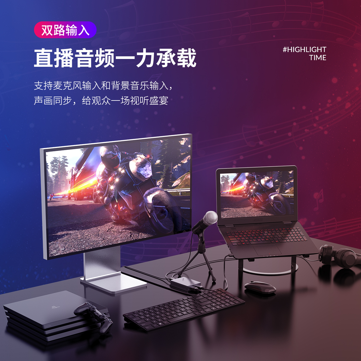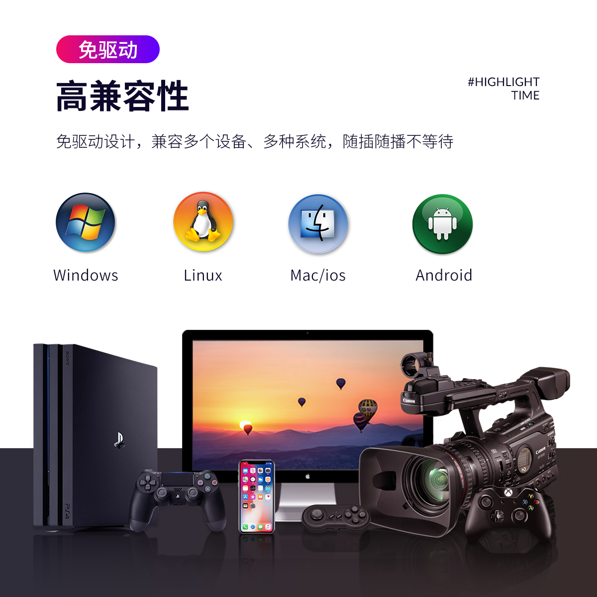 HDMI转USB3.0采集卡,支持1080P@60Hz全高清输入、环出、录制,支持麦克风输入和背景音乐输入, 外壳主体由品质铝合金打造,免驱动设计,兼容多个设备、多种系统,
