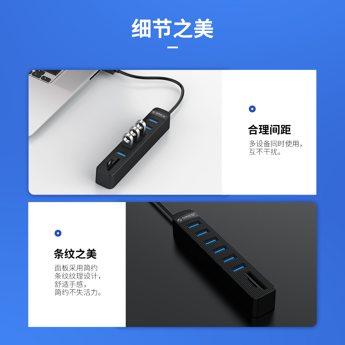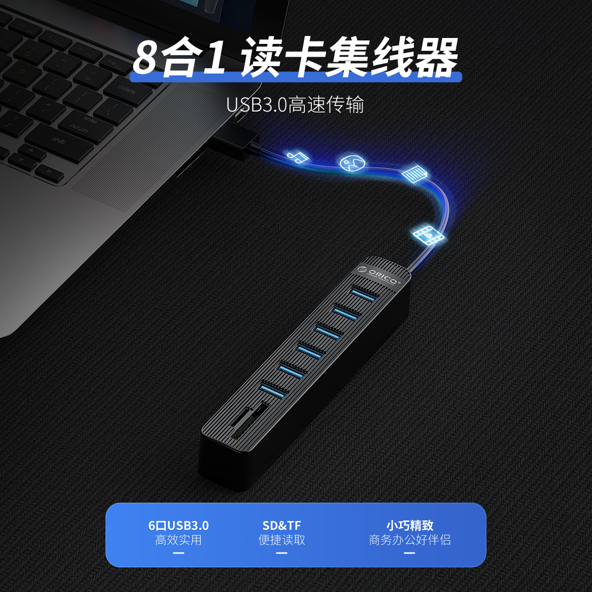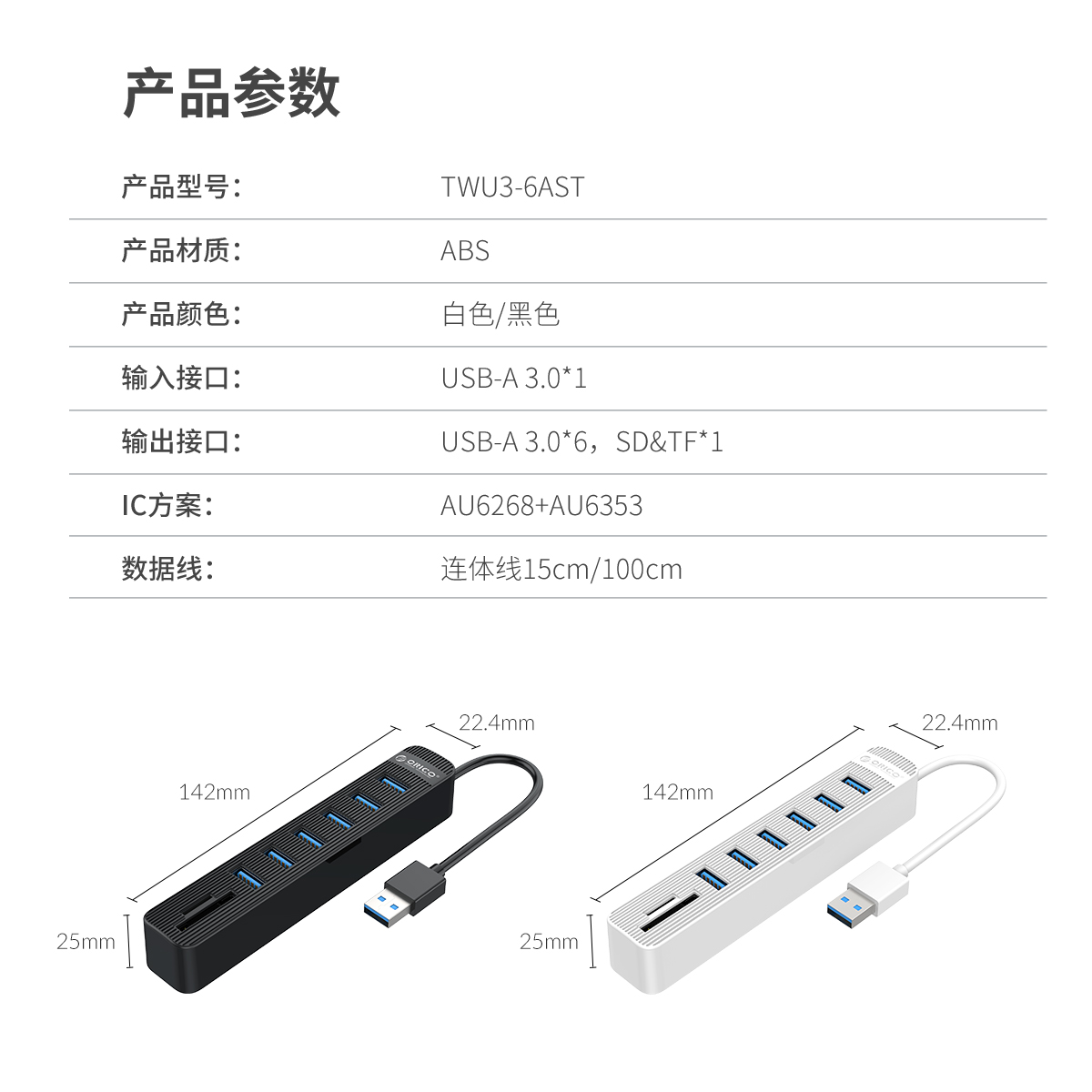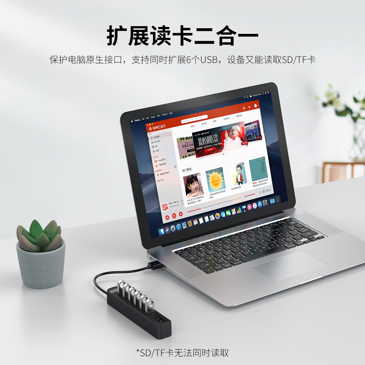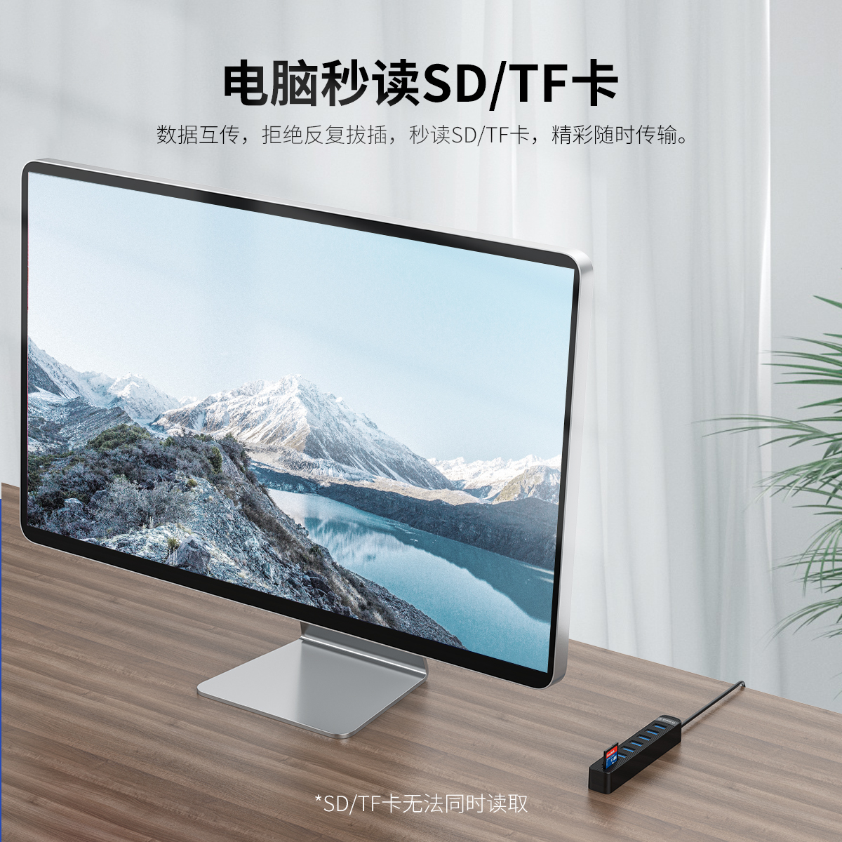 支持同时扩展6个USB,设备又能读取SD/TF卡,5Gbps传输速率,支持2T大容量存储卡、移动硬盘使用