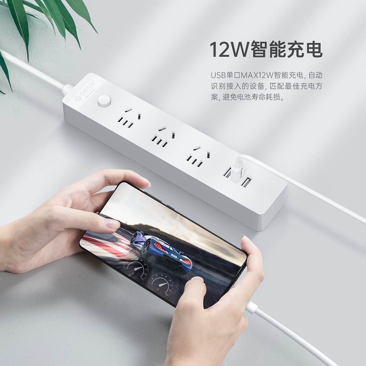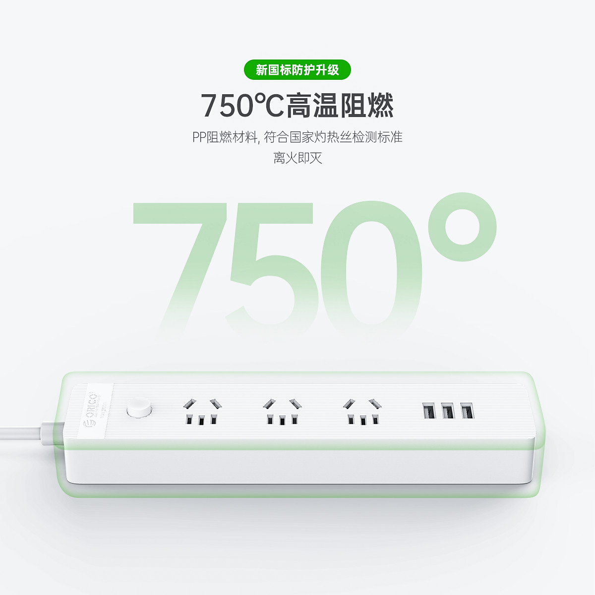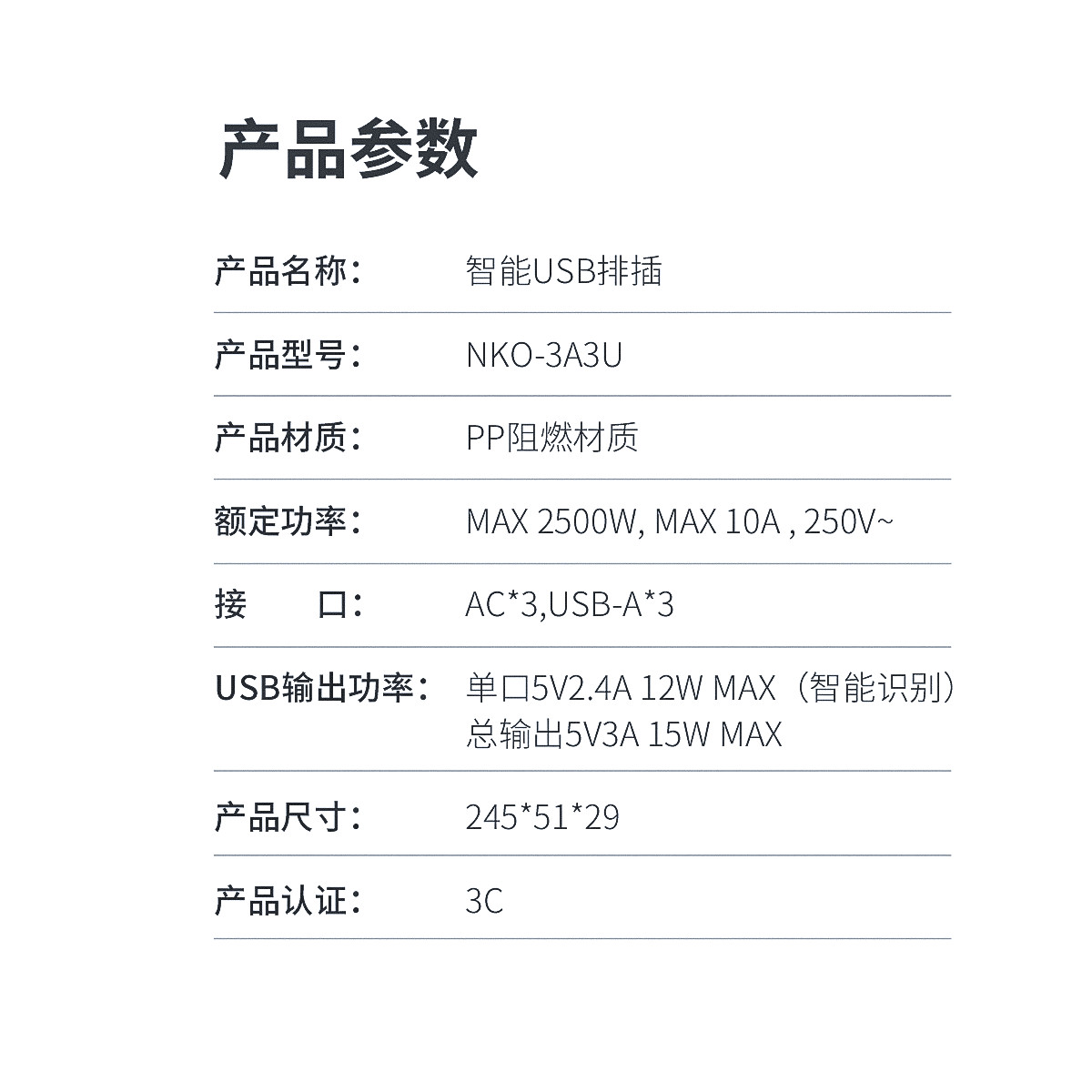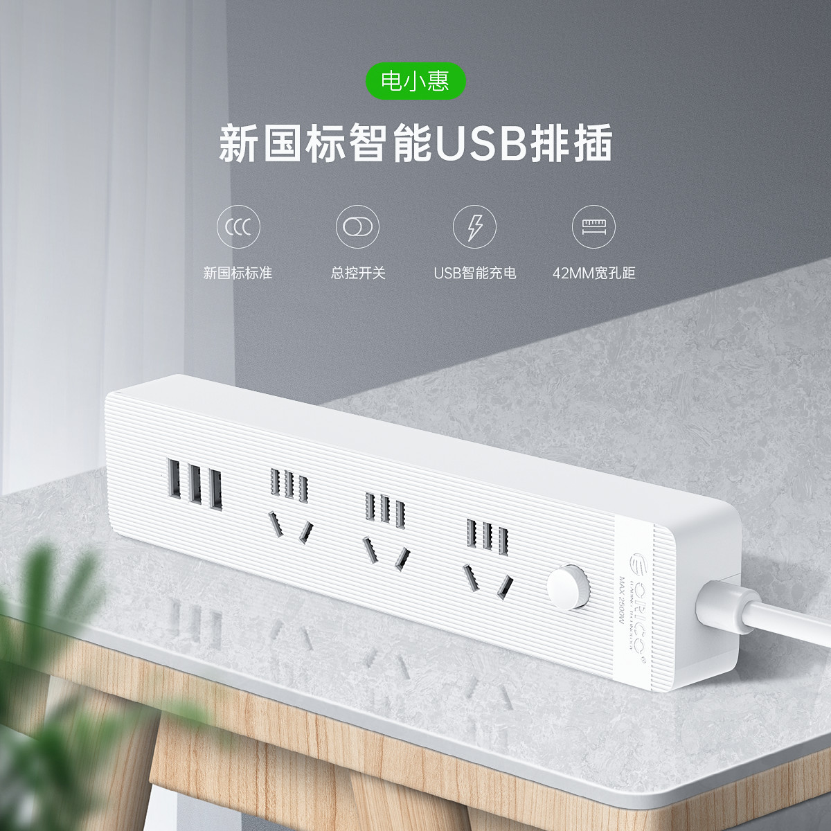 智能USB排插,USB单口MAX12W智能充电,750°C高温阻燃,三芯一体式铜芯线,有1米、1.8米、2.8米3种线长规格,