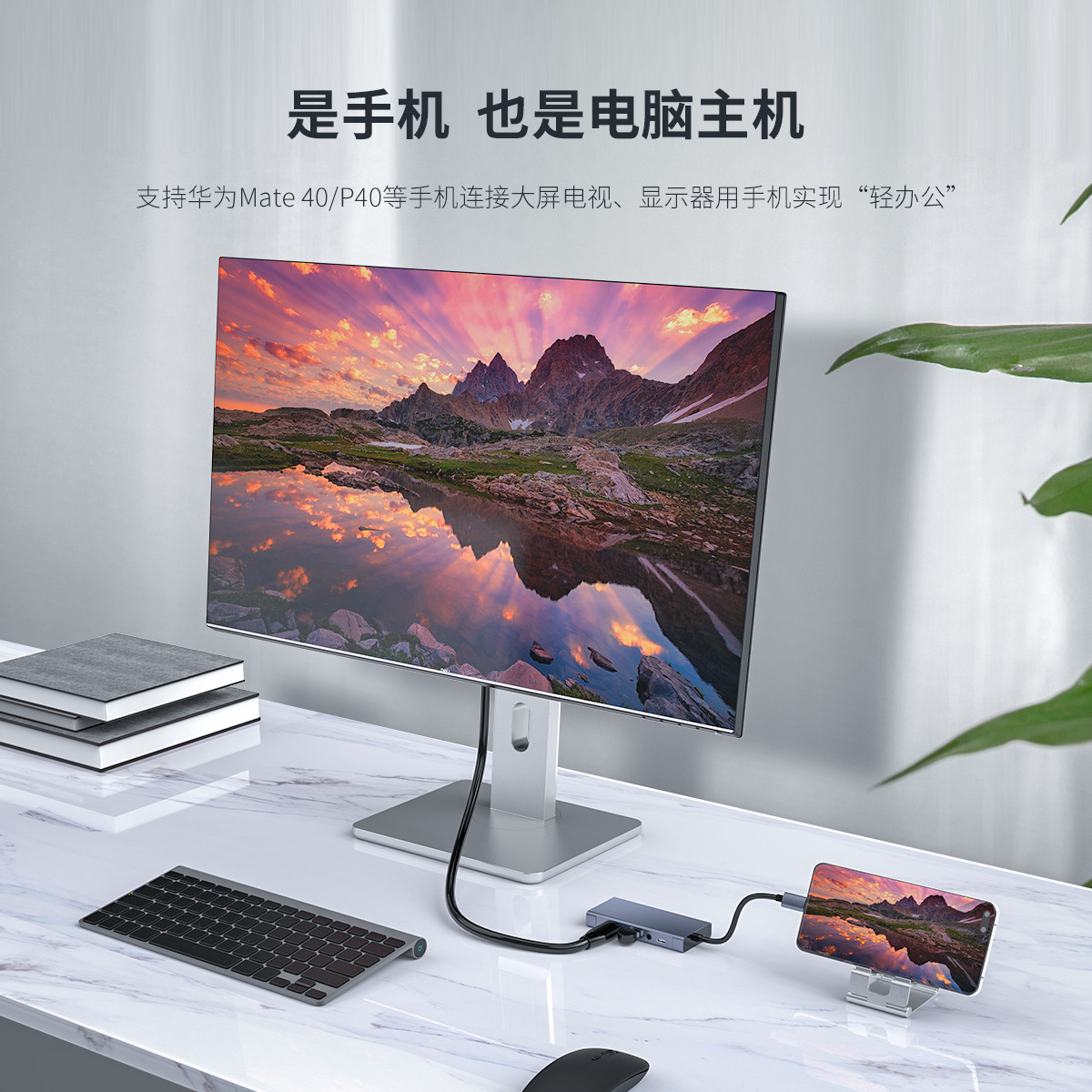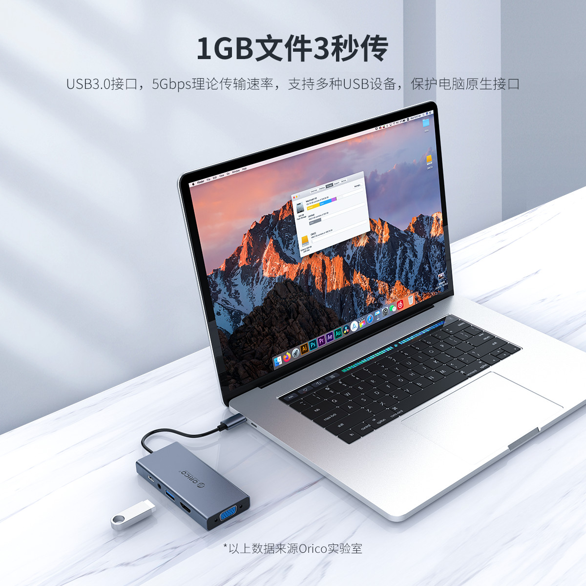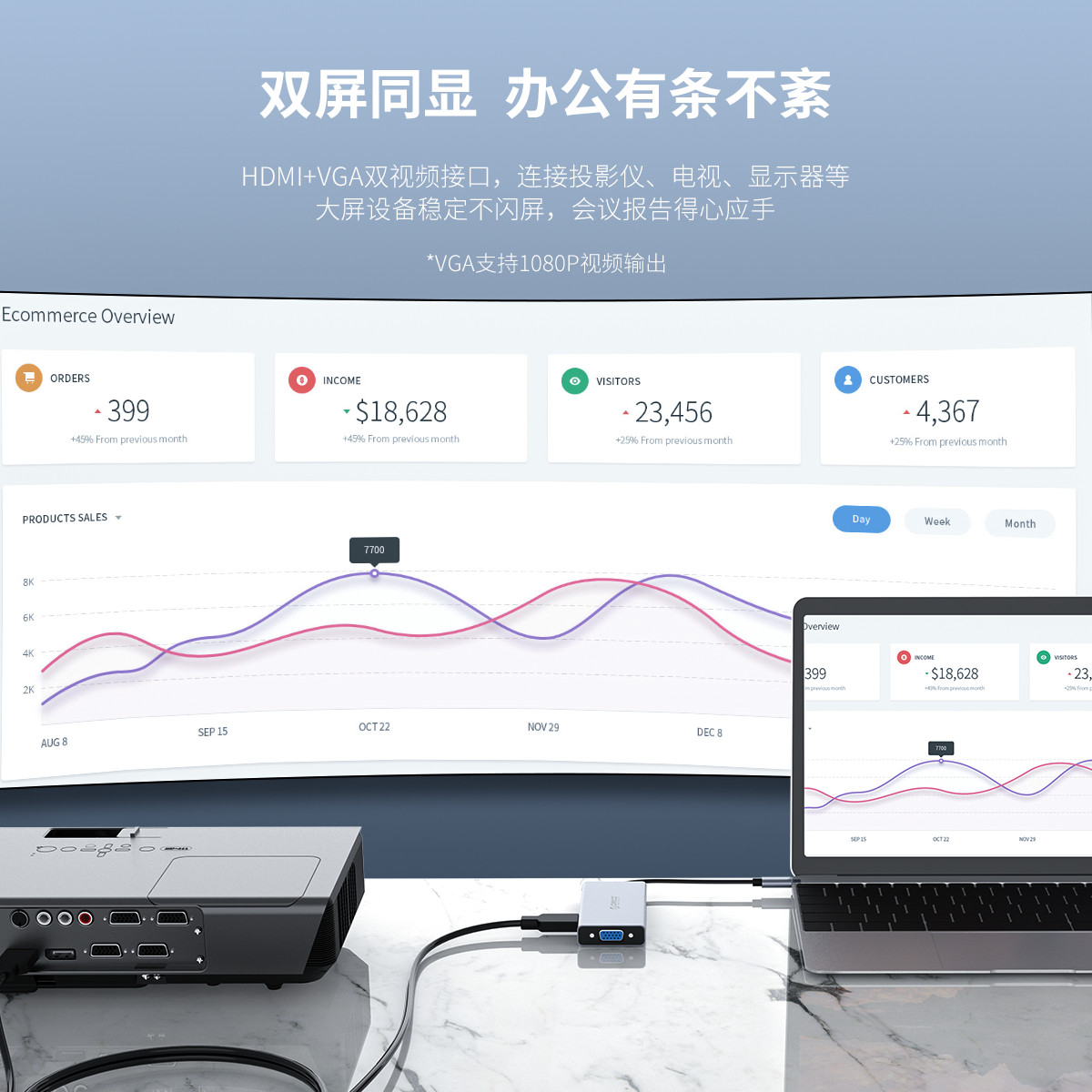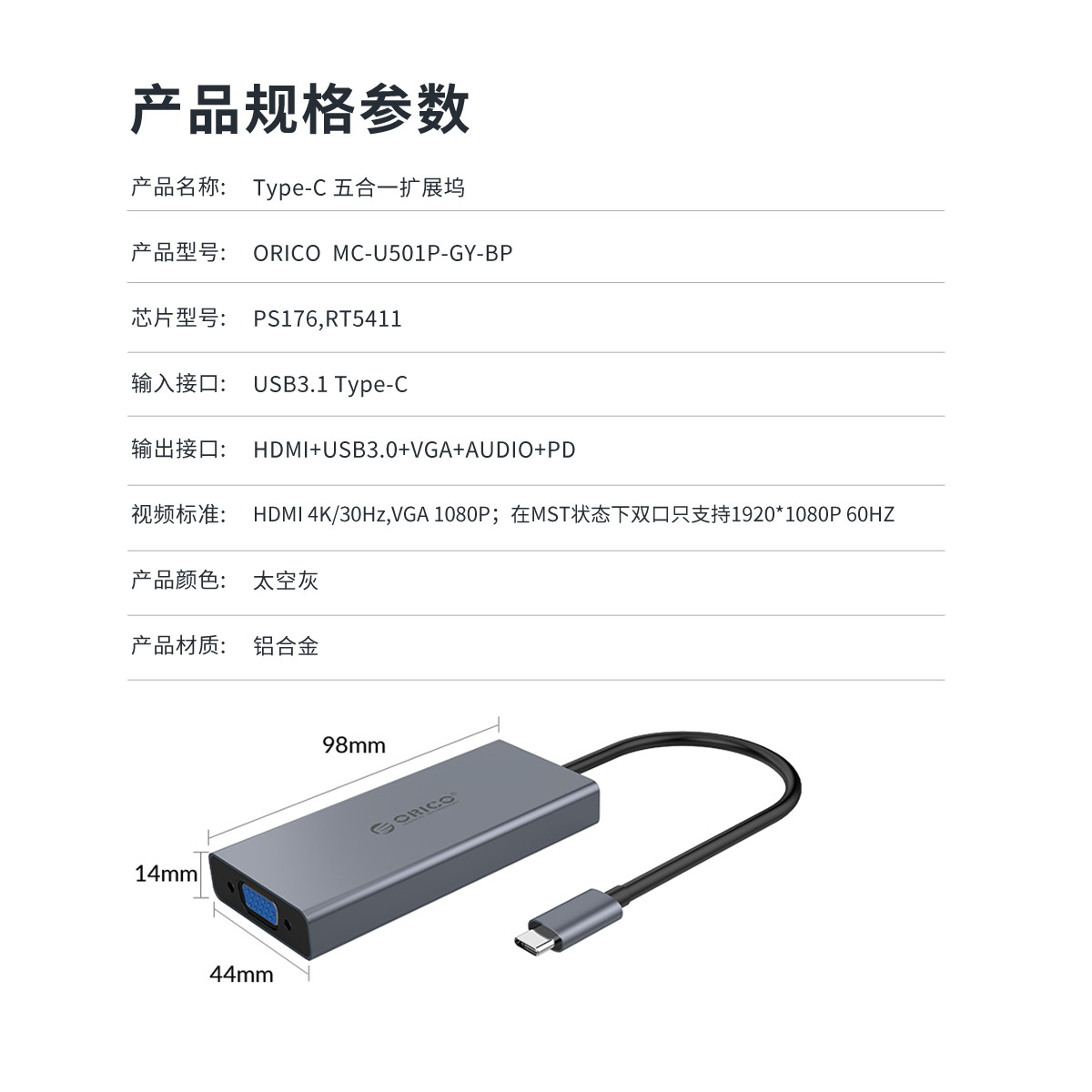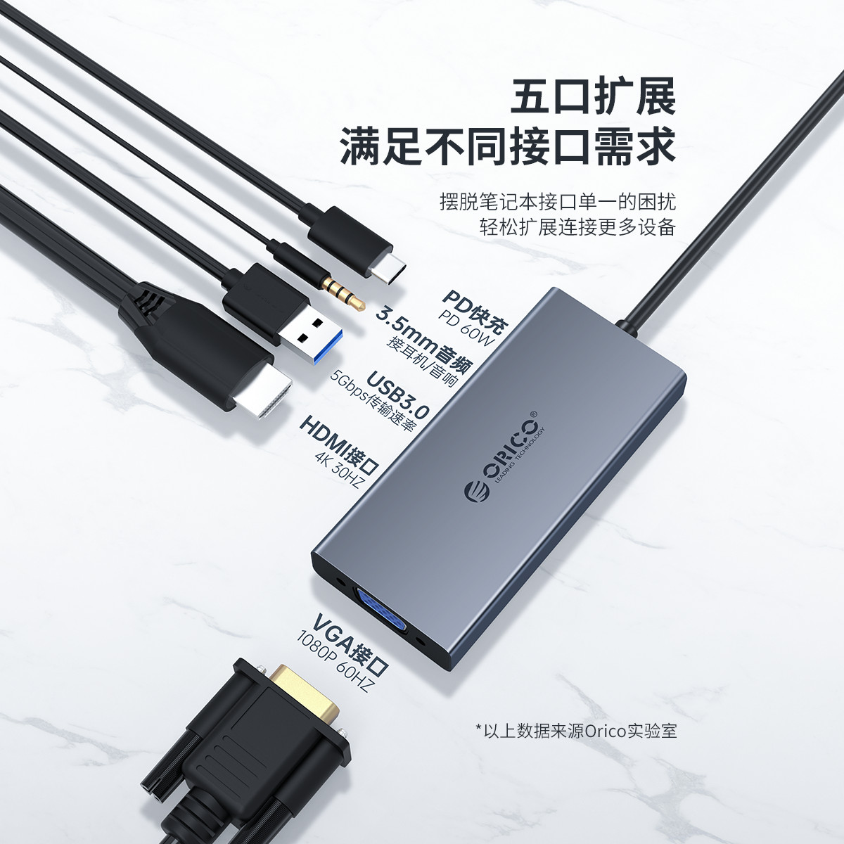 五口扩展,USB Type-C口支持PD2.0,HDMI支持4K 30HZ视频传输,HDMI+VGA双视频接口,标准的DC3.5MM音频接口,内置数字音频编解码器