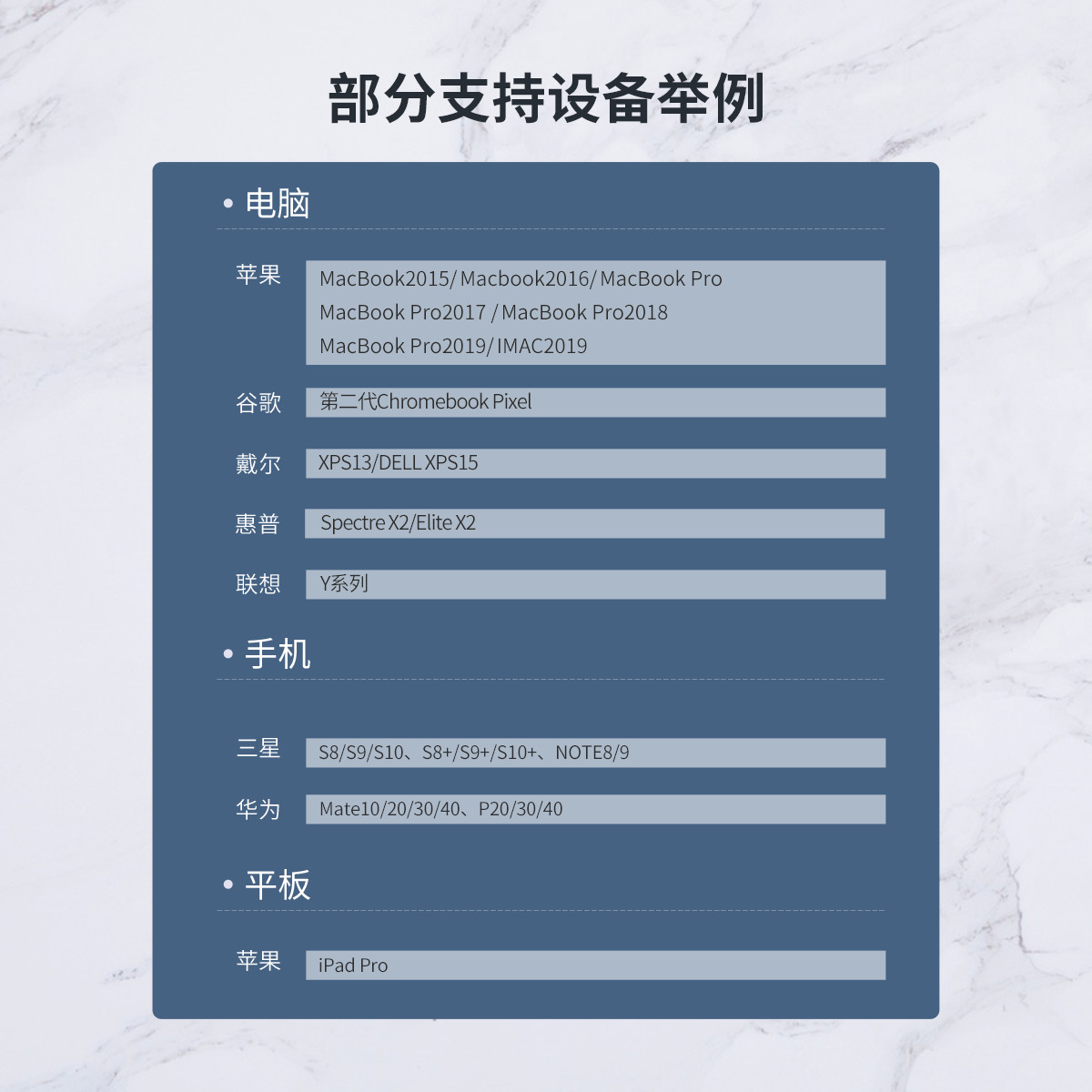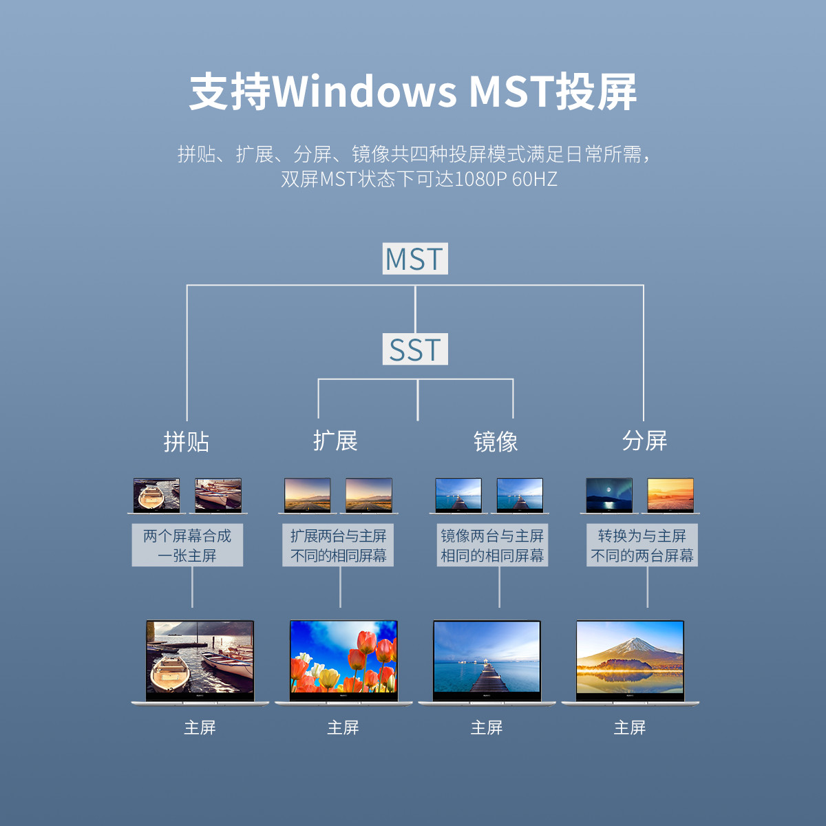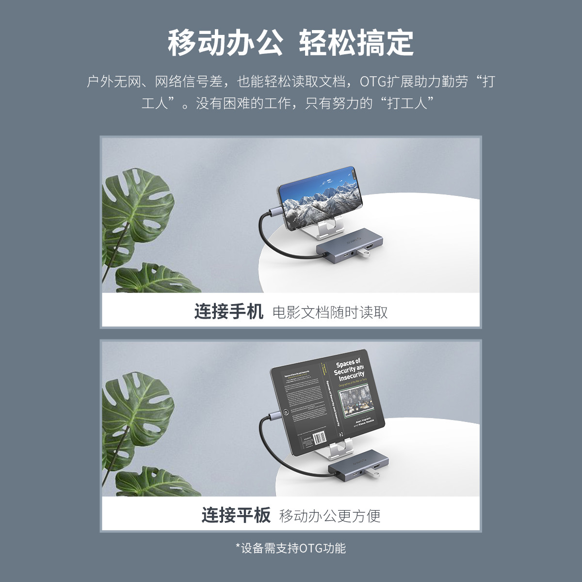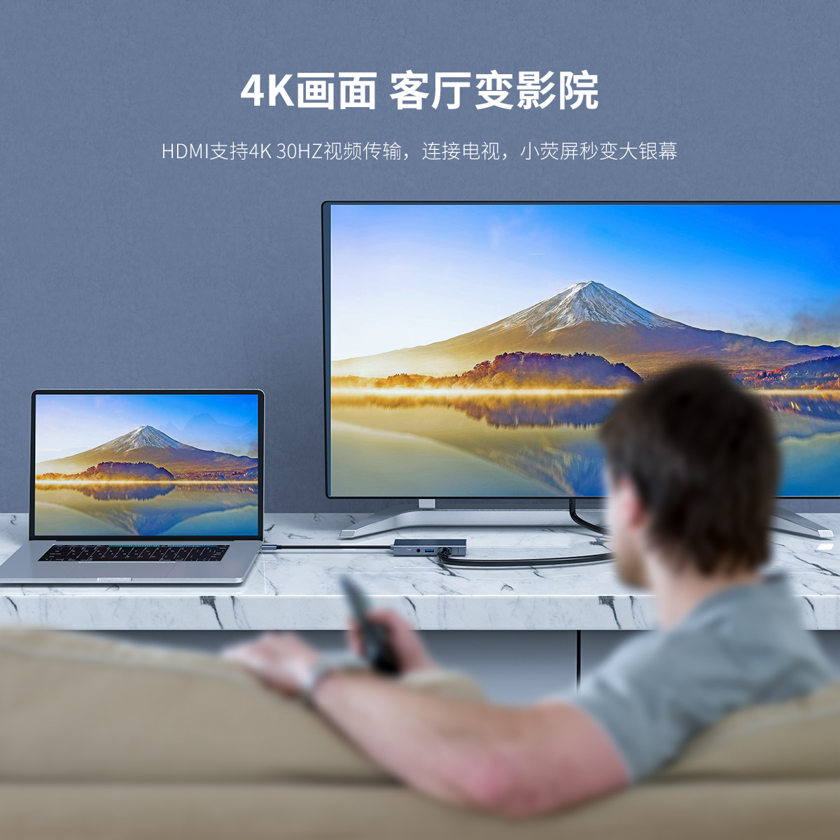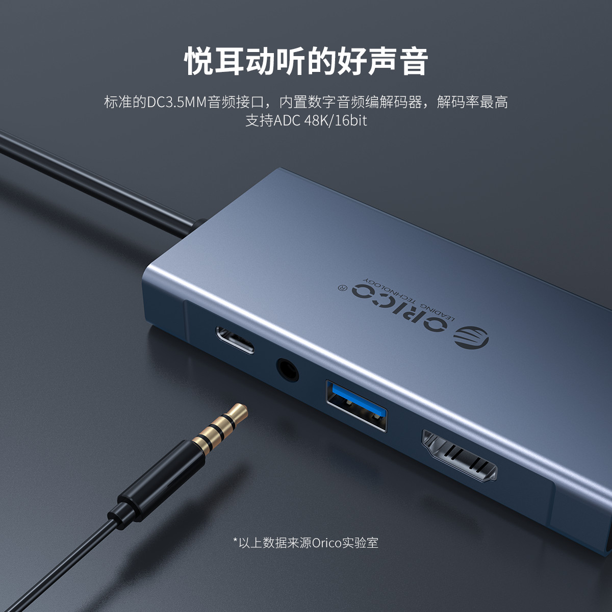 五口扩展,USB Type-C口支持PD2.0,HDMI支持4K 30HZ视频传输,HDMI+VGA双视频接口,标准的DC3.5MM音频接口,内置数字音频编解码器