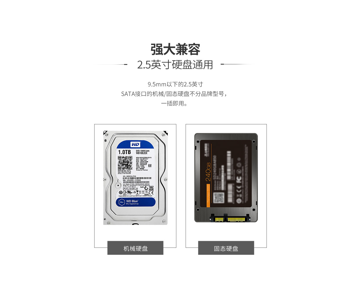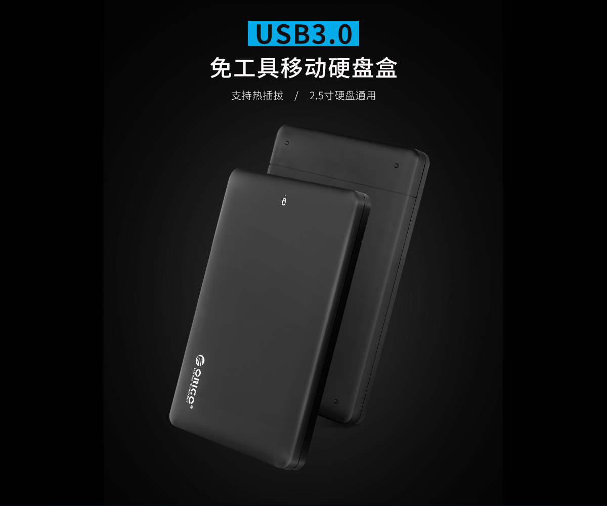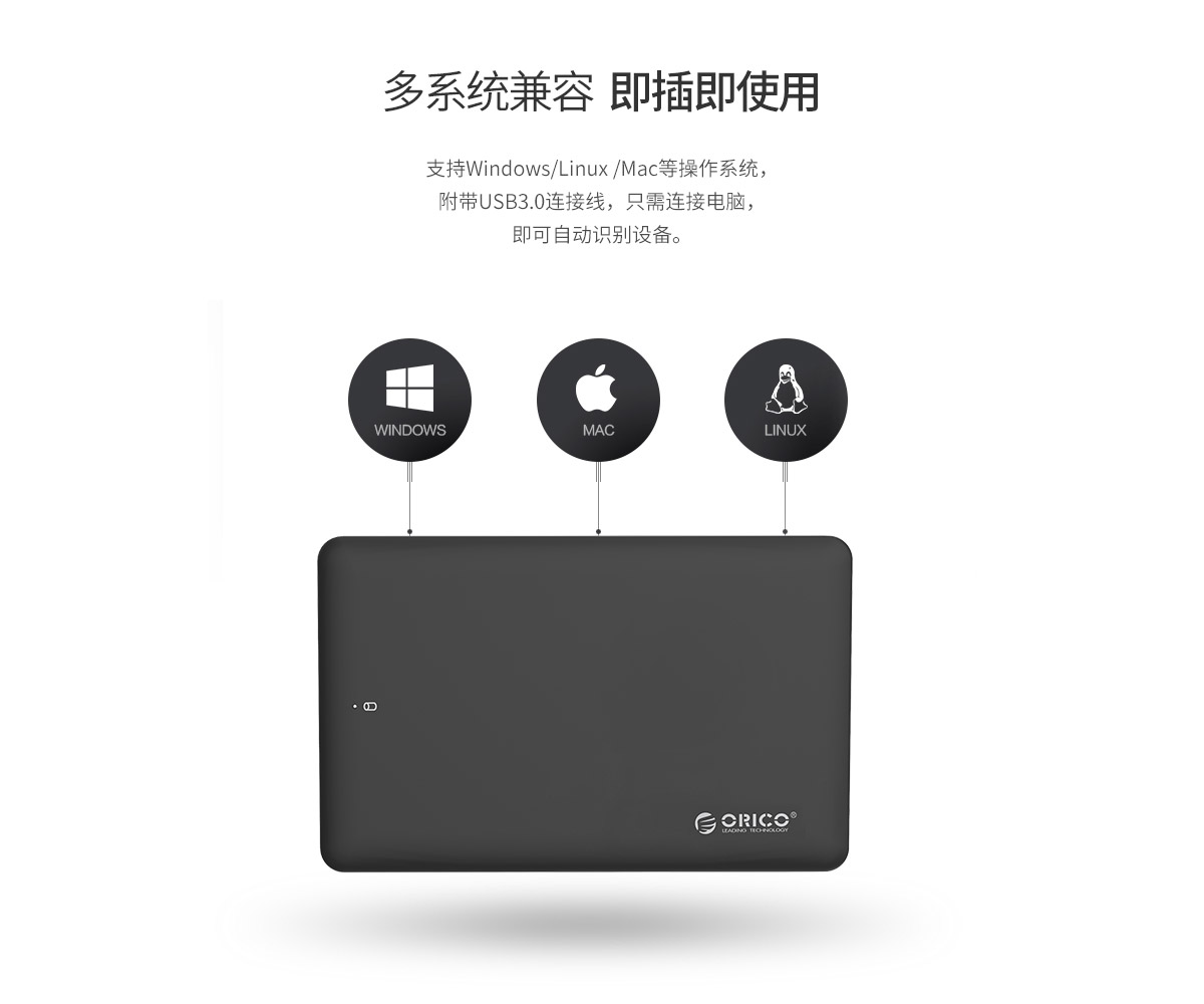 支持9.5mm及以下2.5寸机械硬盘、SSD固态硬盘,采用USB3.0接口5Gbps传输,免工具安装,即插即用。