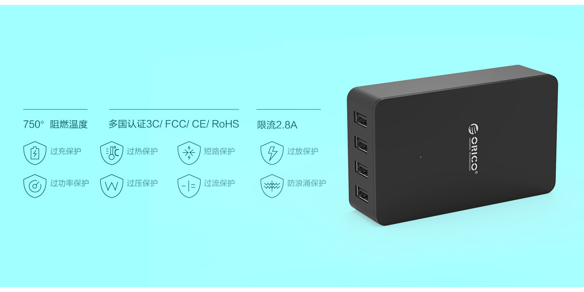 34W大功率输出以确保四台设备快速充电,单口可达2.4A充足电流输出,轻松实现多设备同时充电,要多快就有多快。