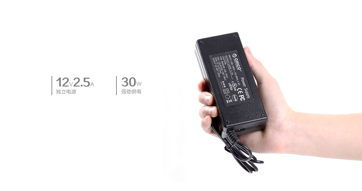 无源HUB在连接移动硬盘等大功率外设时容易出现供电不足的现象,从而伤害硬盘,更可能造成损坏,一旦损坏,硬件事小数据无价! P10-U2配备12V/2.5A独立强劲电源,可为多个USB设备同时运行提供稳定供电。