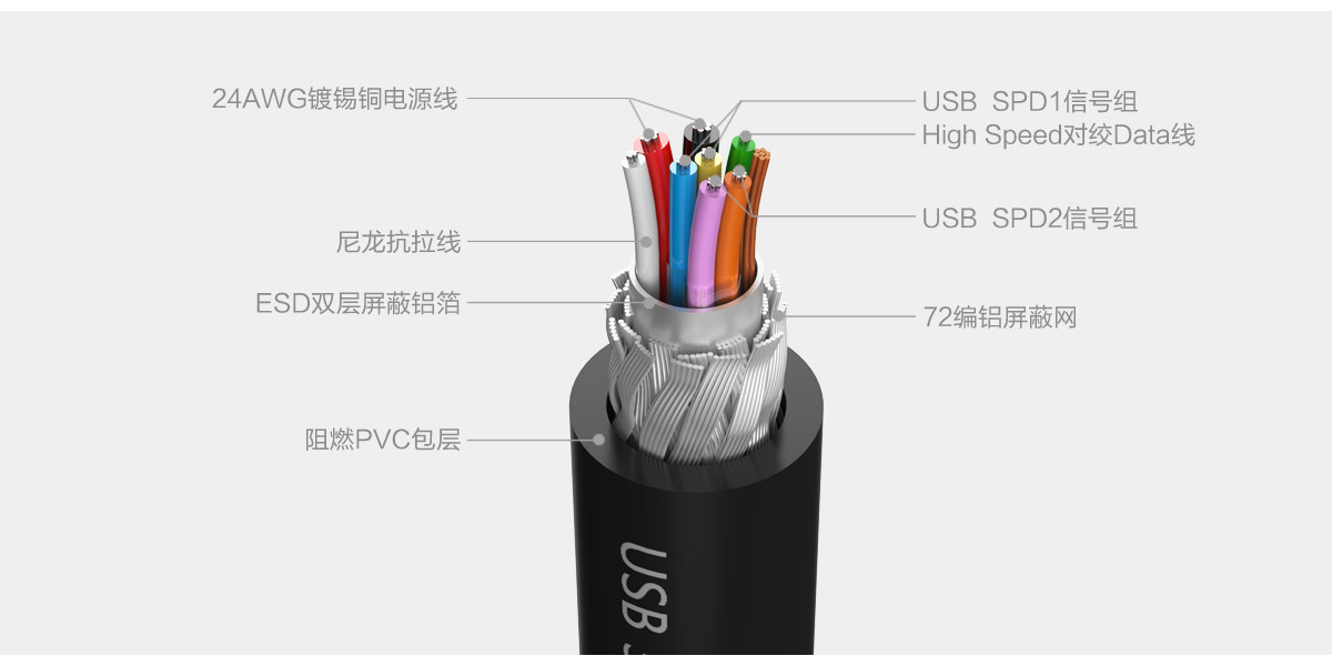 线材与传输性能,是选用HUB关键因素之一,ORICO选用线材,品质经严格测试更有保障!数据线采用高标准双绞线,附铝箔屏蔽层,确保抗干扰性,7芯99.9%无氧铜芯线确保高速传输