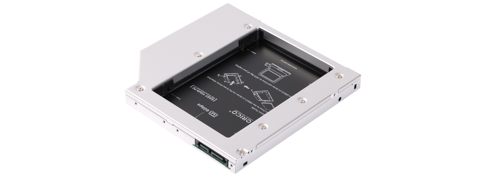 ORICO L127SS笔记本光驱位硬盘托架采用镁铝合金外壳内置塑料框架的设计,金属外壳表面有点阵纹理并采用多枚螺丝固定,背面是表面有点阵纹理并采用多枚螺丝固定的镁铝合金外壳。托架中间位置可安装一个2.5英寸SATA硬盘固态硬盘,通过替换笔记本内置的光驱从而增加存储容量和读写性能。