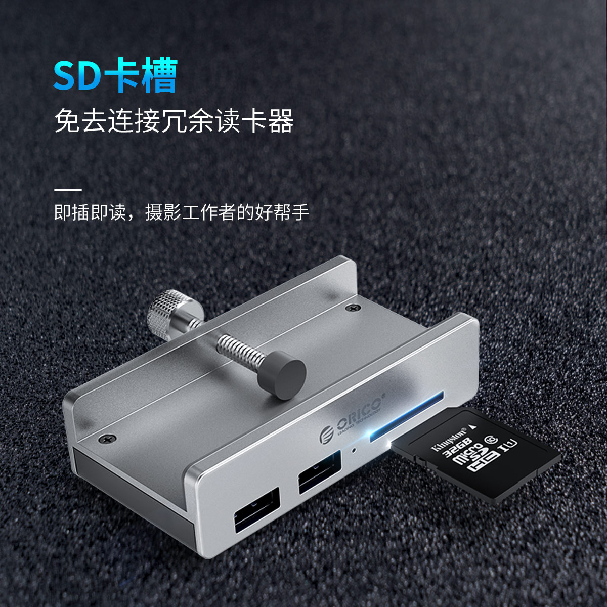 USB3.0*2+SD卡槽扩展 夹扣式设计 蓝色LED指示灯 铝合金机身