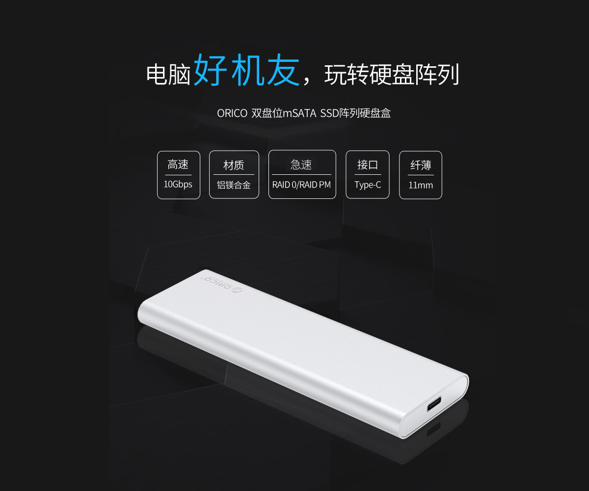 mSATA双盘位阵列硬盘盒,Type-C接口
