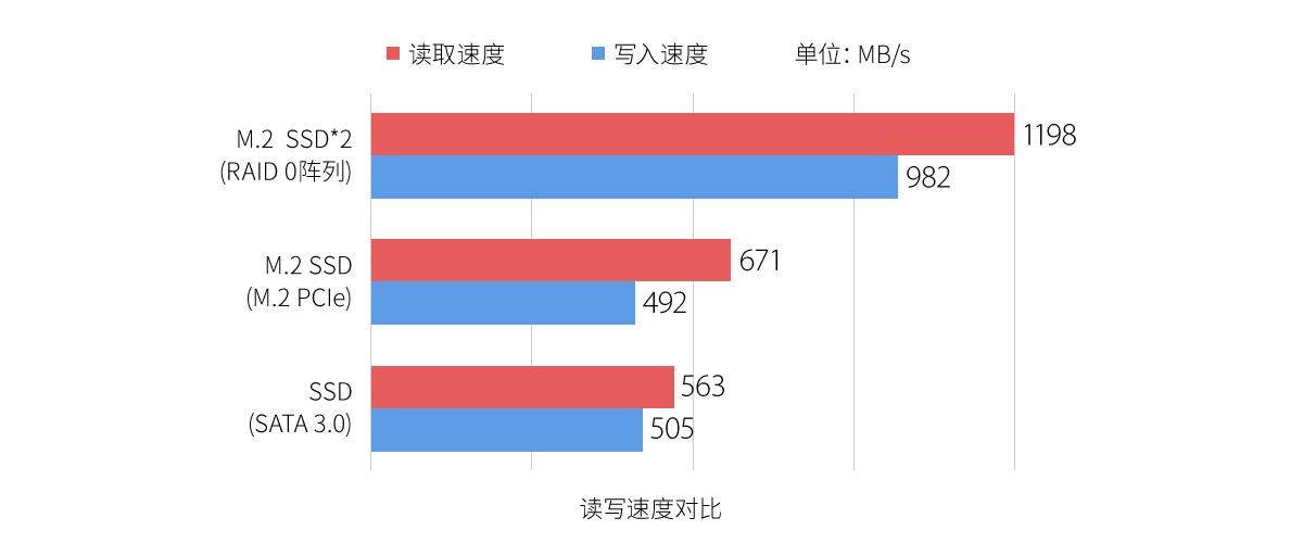 普通M.2接口的SSD,读写速度一般在3-400MB/S左右。通过磁盘陈列RAID 0模式,让普通M.2速度提升两倍,让电脑主板上的PCIE高速接口发挥它真正的性能,实际读取可达800MB/S,写入达700MB/S,远远地甩开一般固态硬盘一条街!