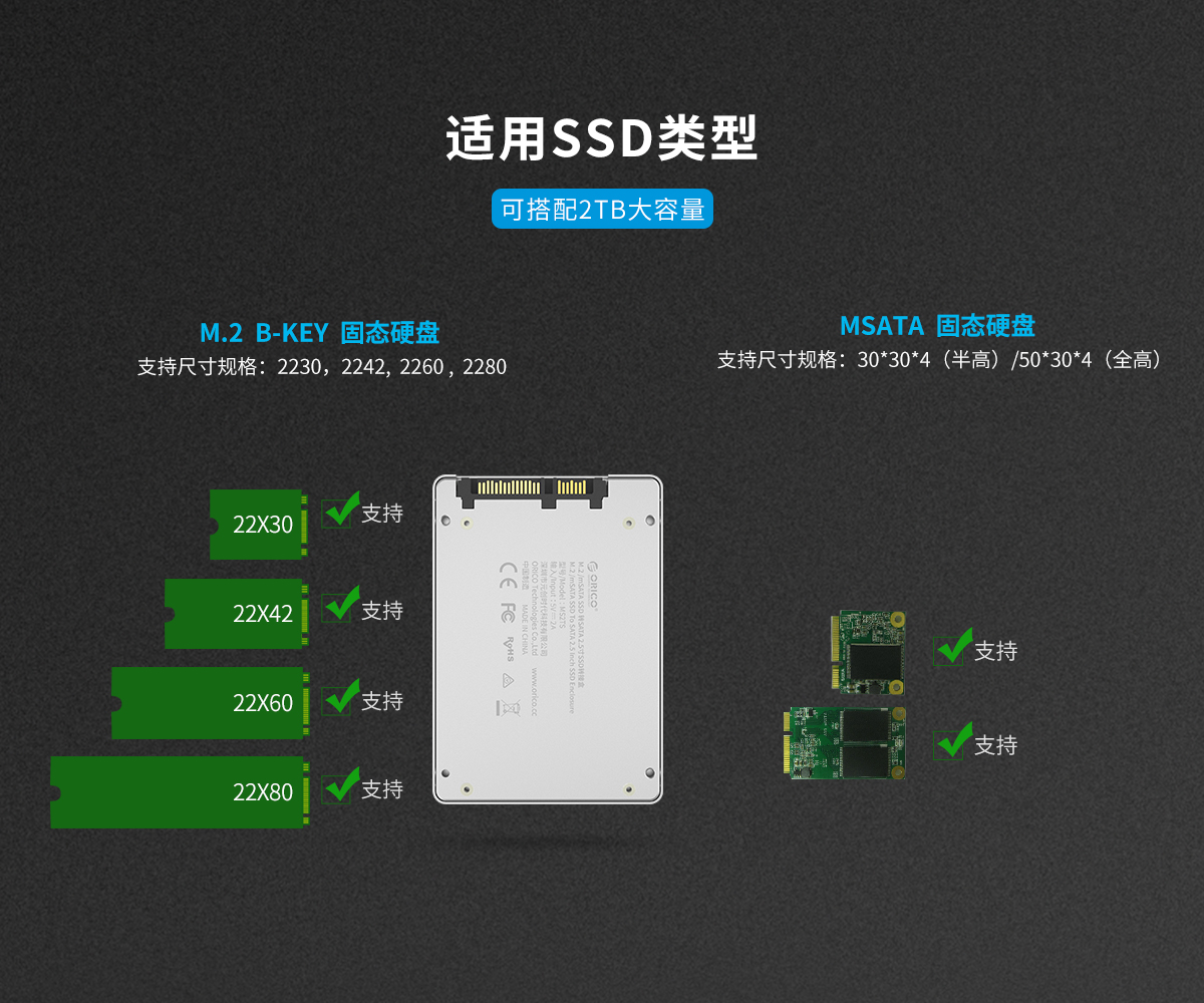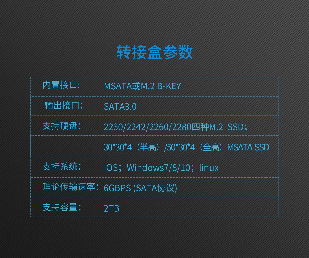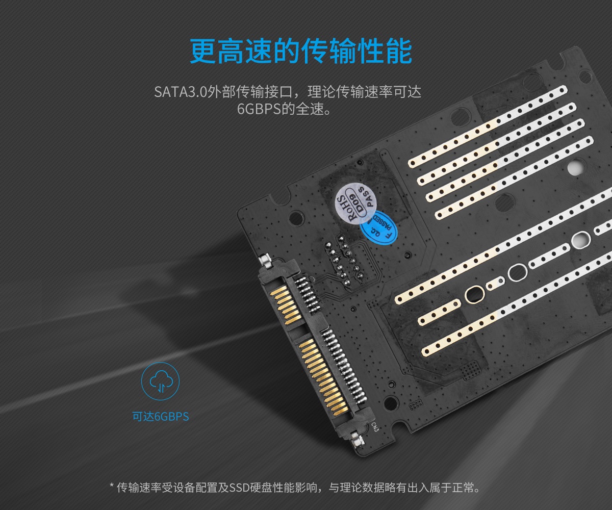 铝合金材质,支持2230/2242/2260/2280四种M.2 SSD,6Gbps顶速传输,2TB大容量支持。