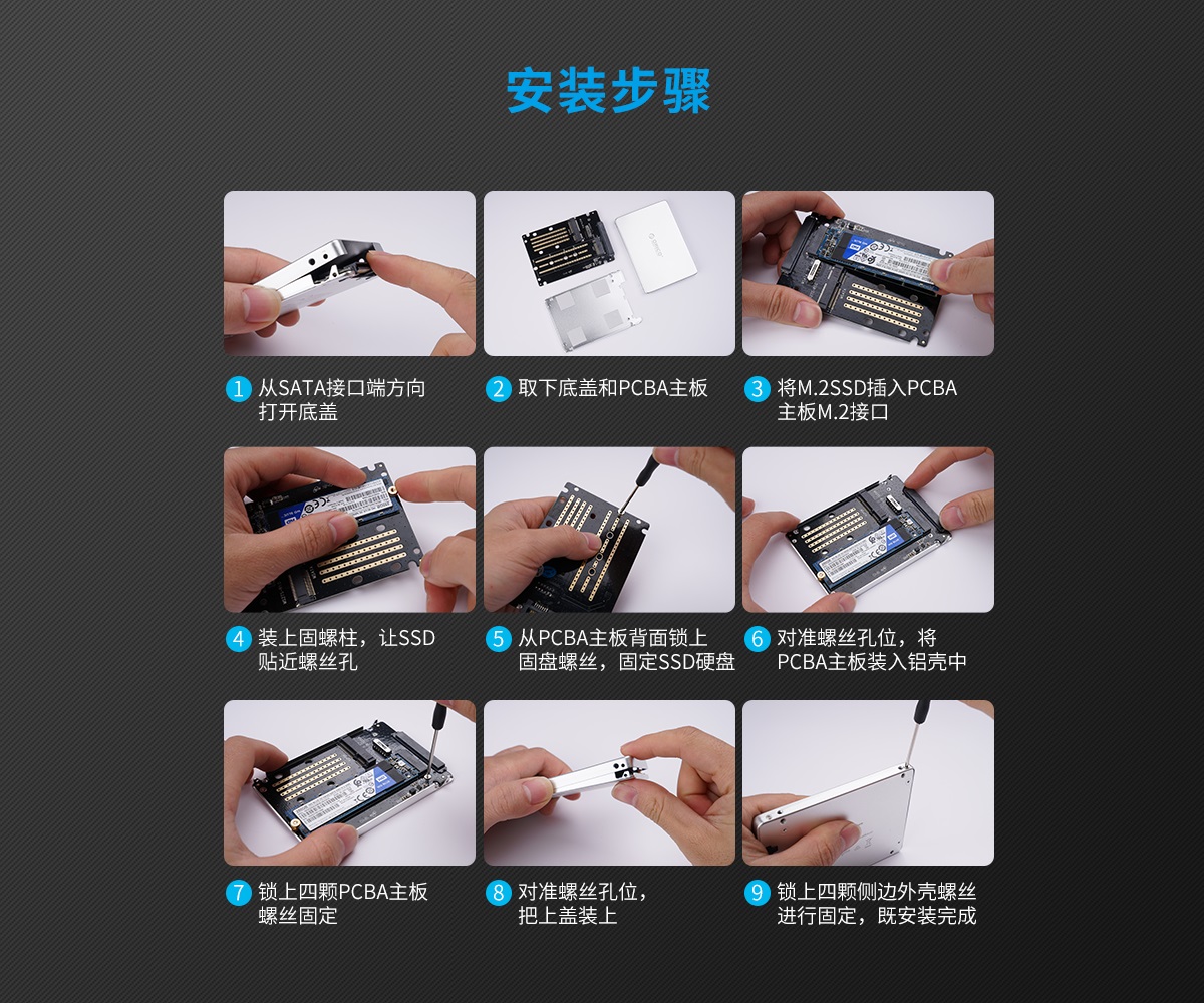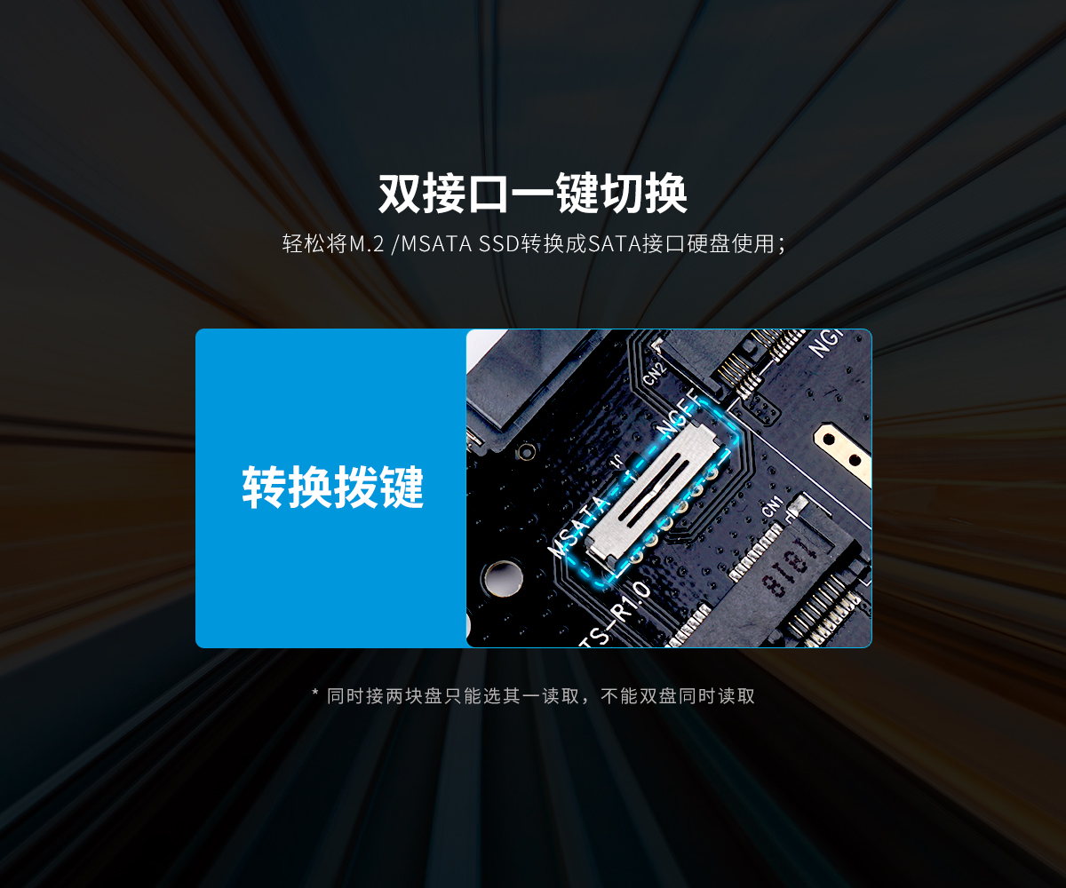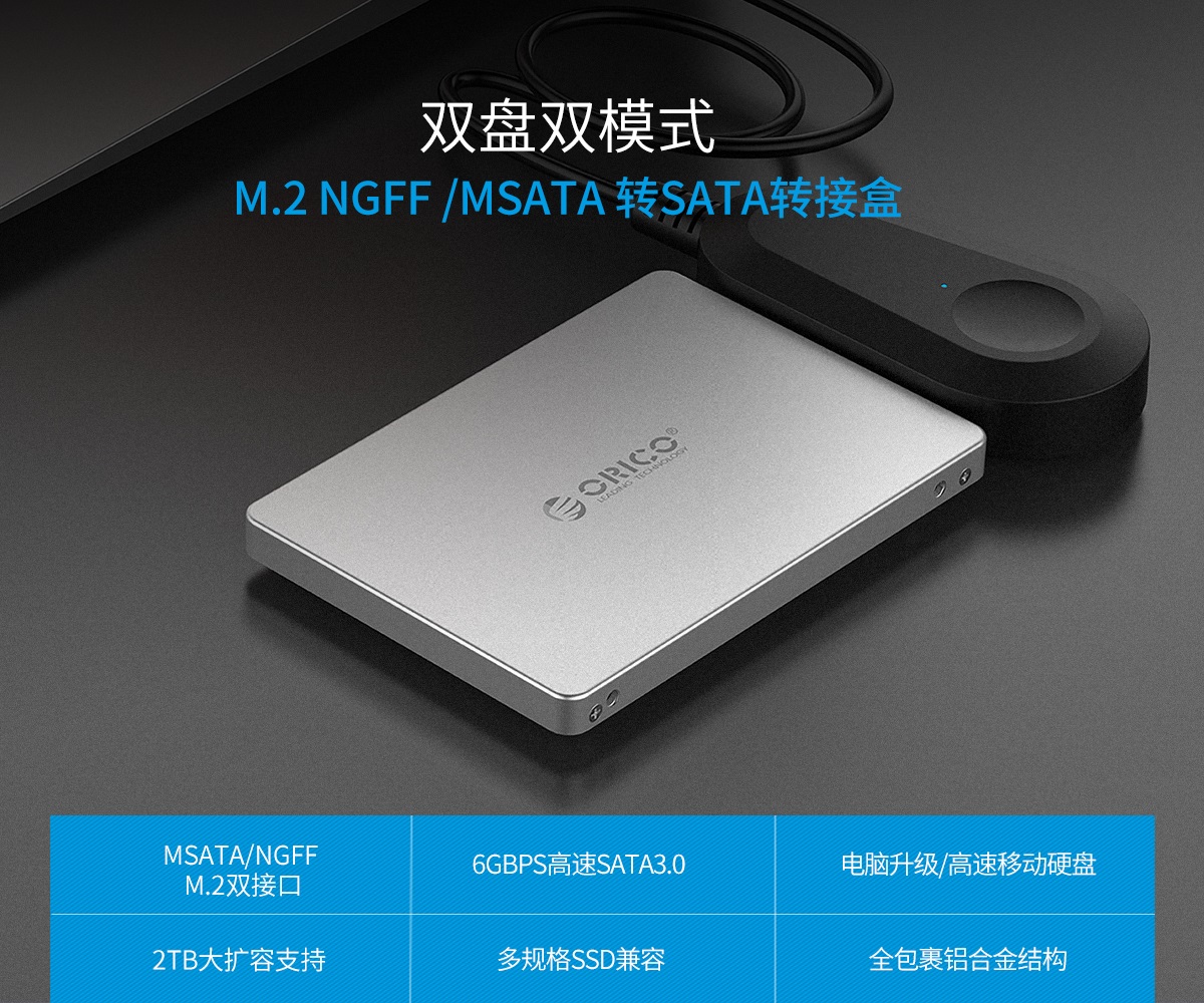 铝合金材质,支持2230/2242/2260/2280四种M.2 SSD,6Gbps顶速传输,2TB大容量支持。