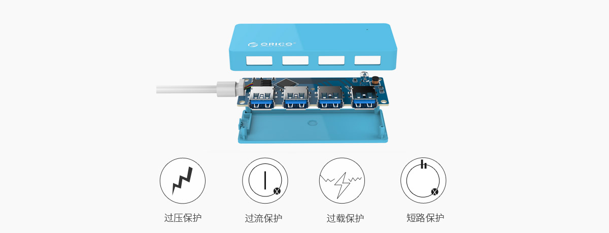 内置多重安全保护模块,可以防止过压、过流等,可以保护HUB以及接入的USB设备的安全。