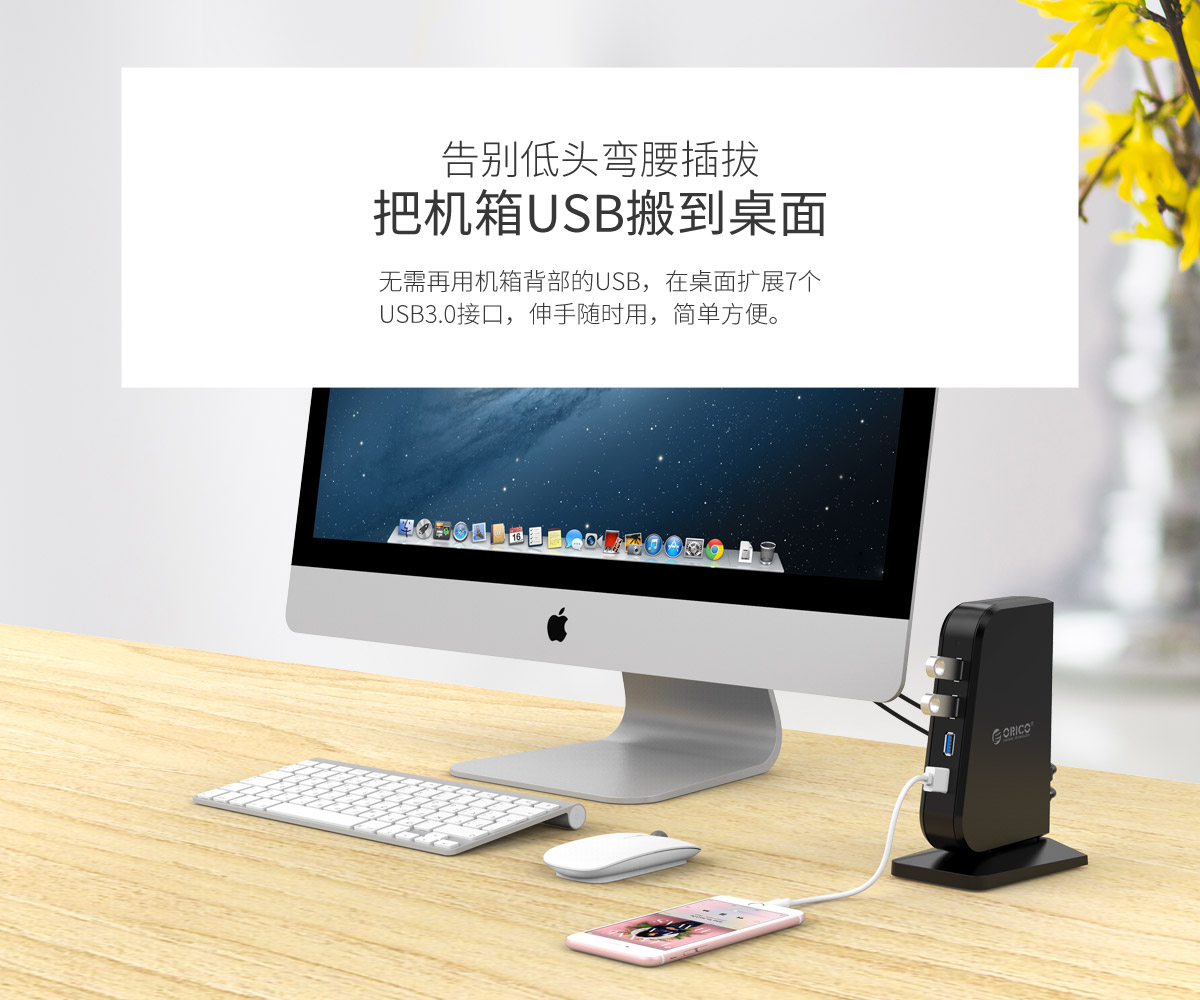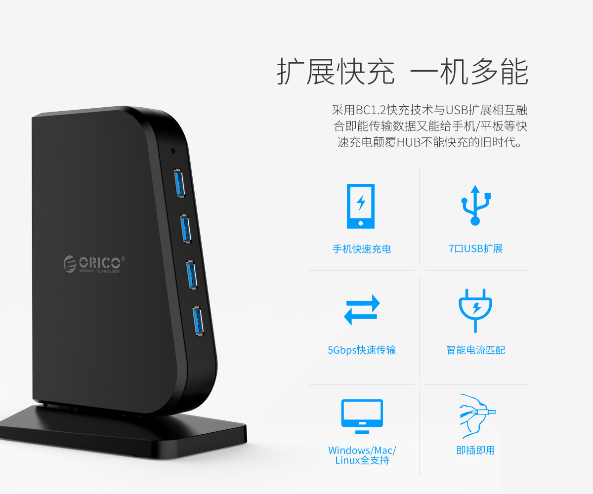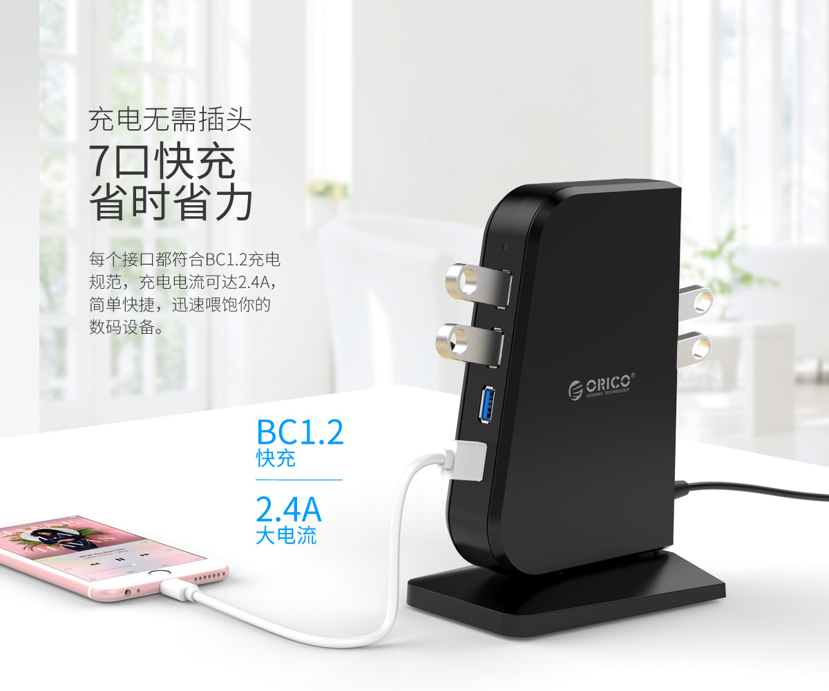 7口USB3.0集线器 立式设计 LED蓝色指示灯 均支持BC1.2快速充电