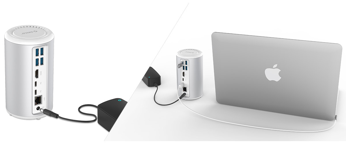 1、搭配台式机/普通不支持PD的笔记本等设备,直接使用DC 12V接口即可使用; 2、搭配支持PD功能的笔记本,可使用笔记本原装充电器,或是支持Type-C PD功能的充电器通过数据线连接支架中的Type-C PD接口,给笔记本进行反向供电。