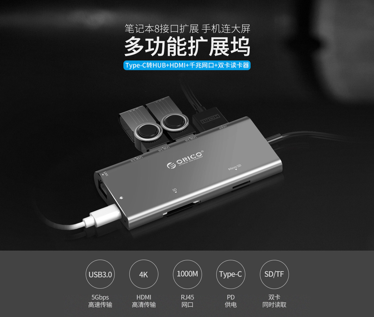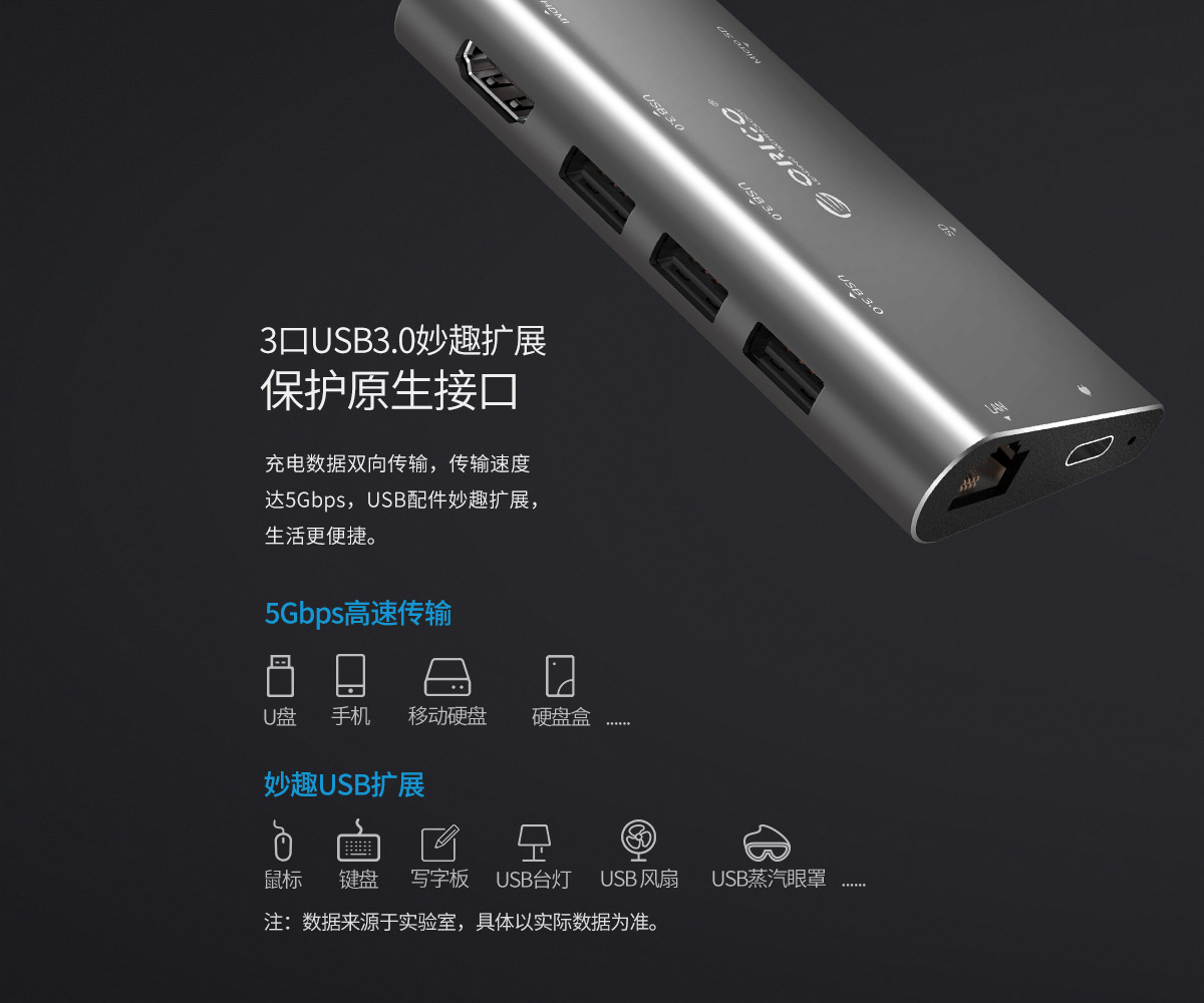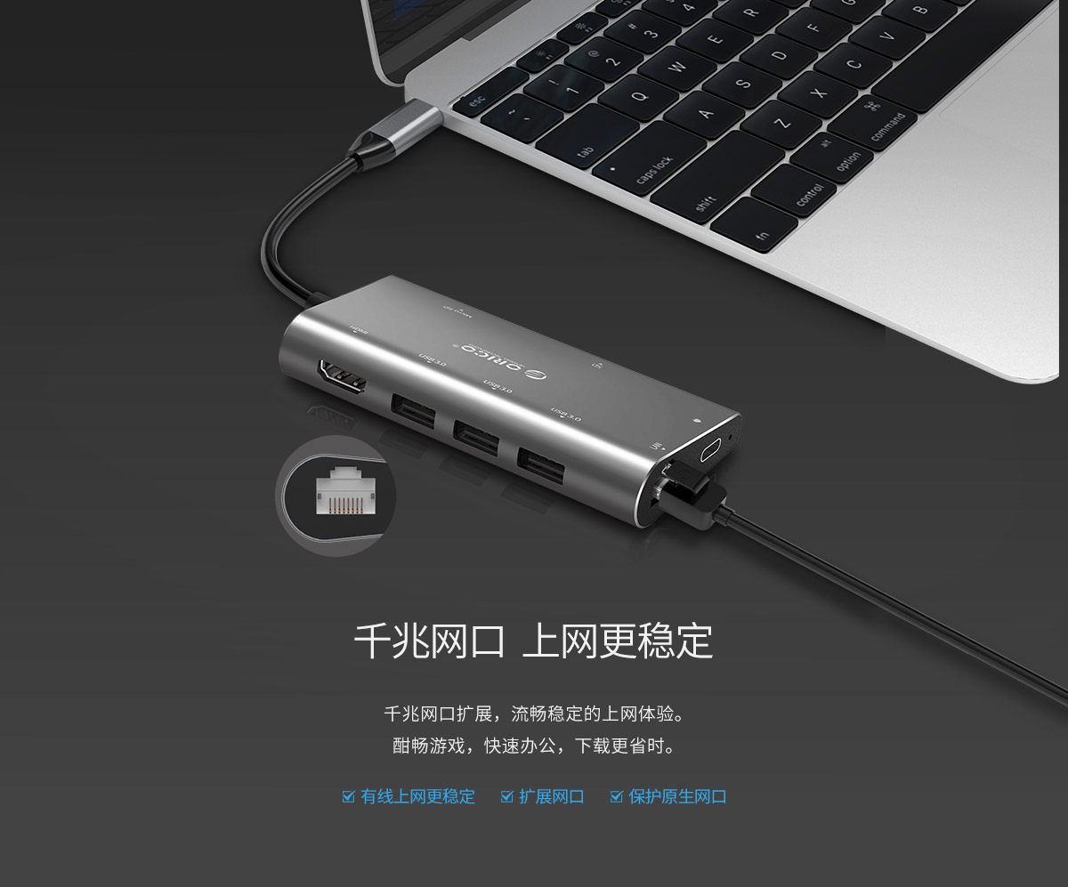 铝合金外壳 高清视频接口扩展 多接口多功能扩展 连体数据线设计 千兆网口扩展