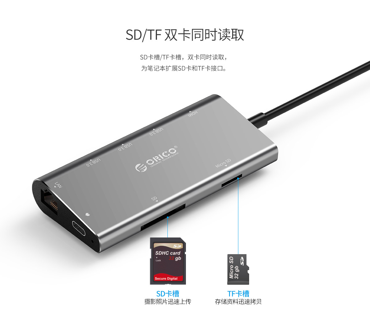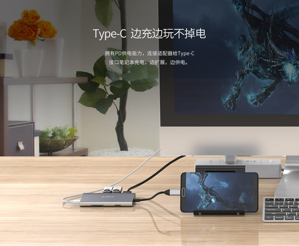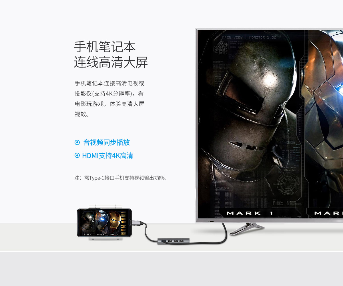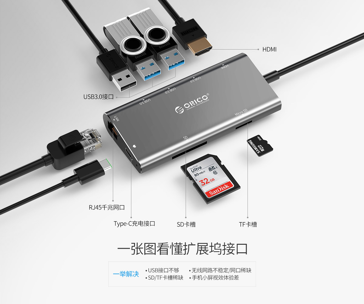铝合金外壳 高清视频接口扩展 多接口多功能扩展 连体数据线设计 千兆网口扩展
