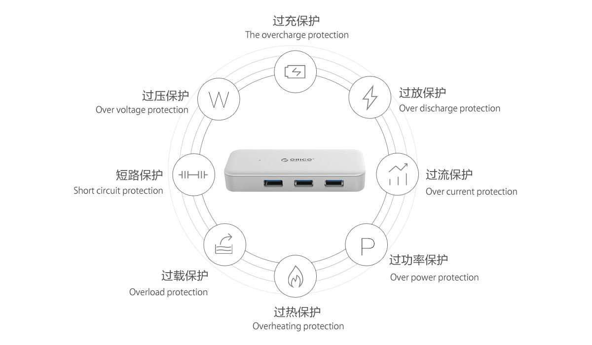 支持过载电压及瞬间电流保护功能,有效保护被连接的设备和HUB本身。