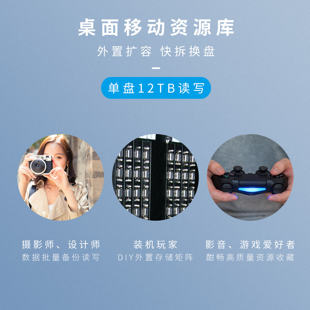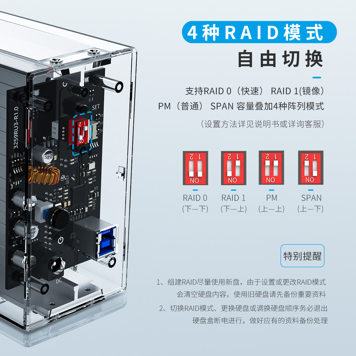 4种RAID模式自由切换,兼容3.5寸SATA硬盘,无需驱动,即时插拔,智能休眠