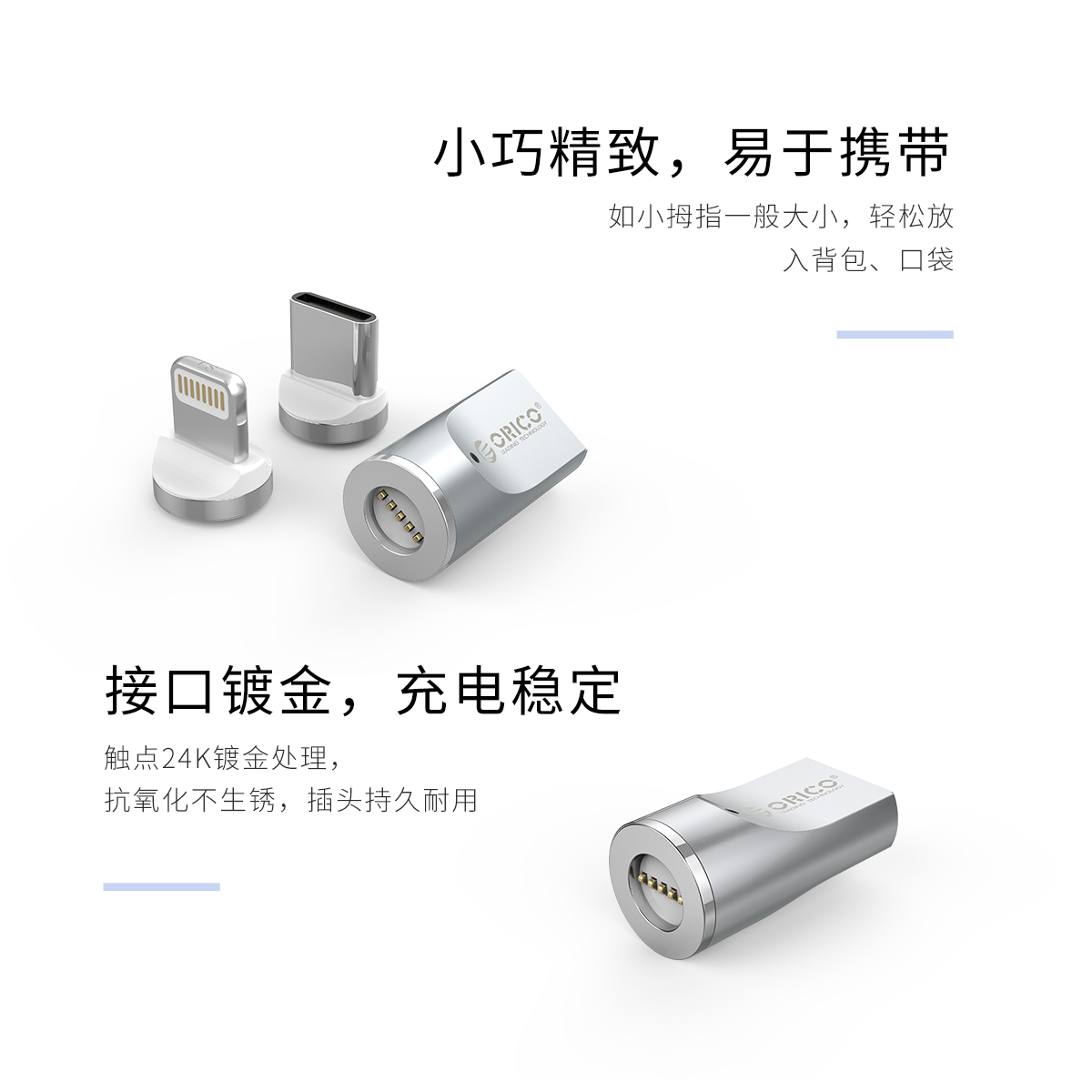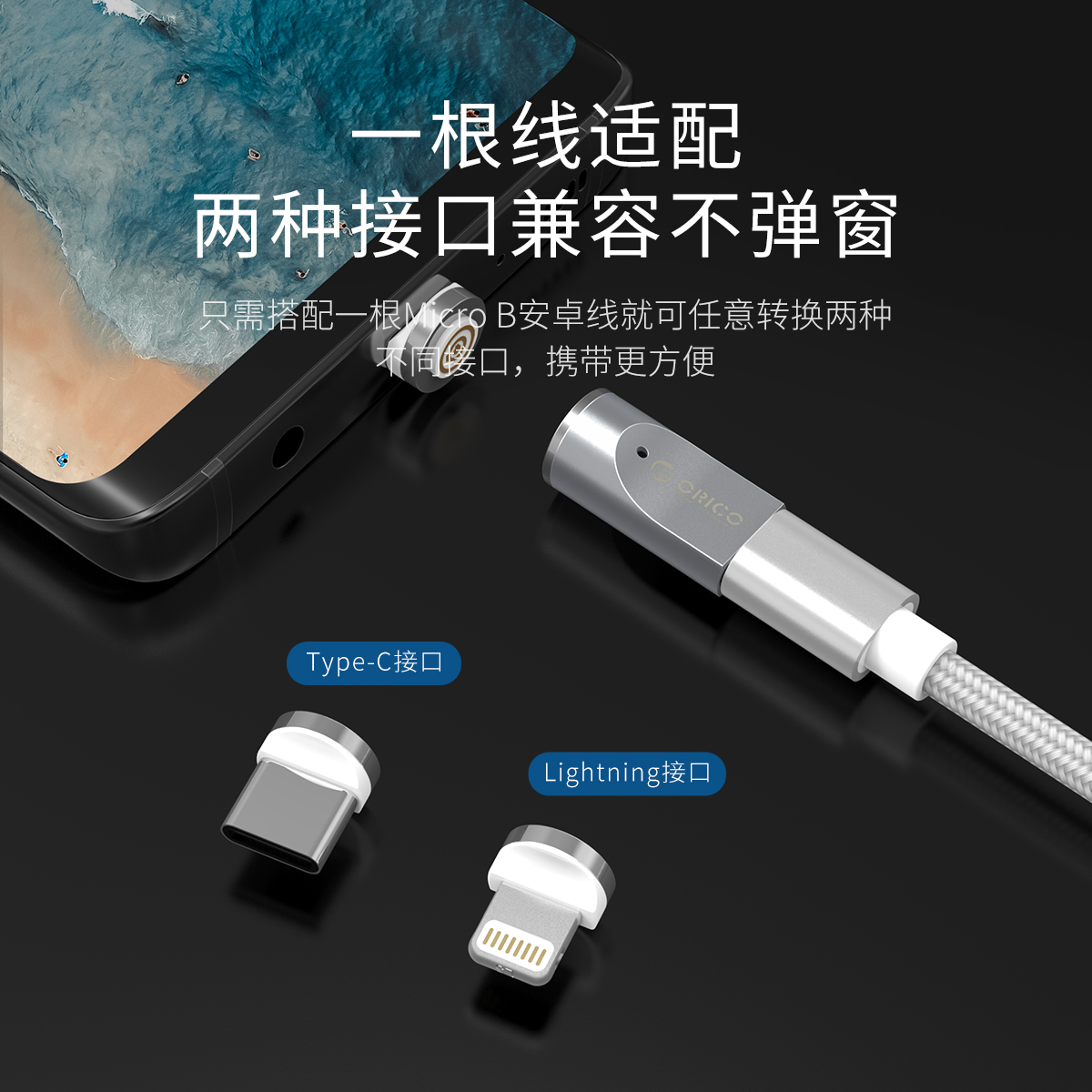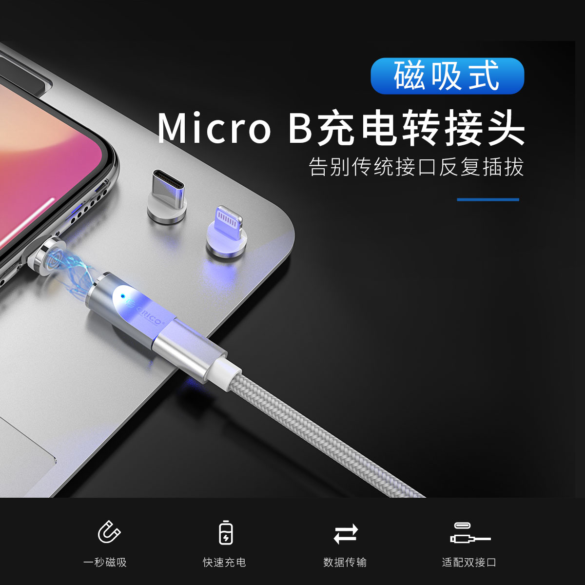 适配双接口,一秒磁吸,快速充电,360度可转动插拔,充电稳定,LED指示灯