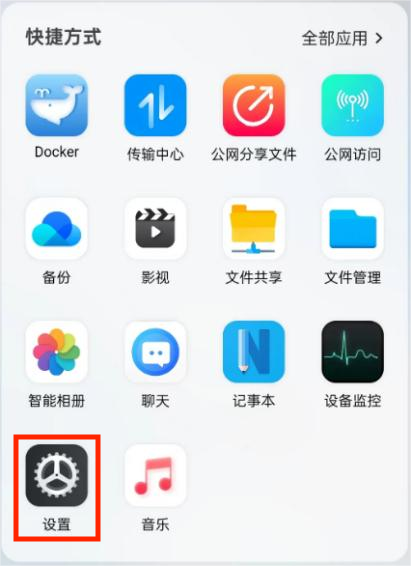 打开赛博云空间APP首页,找到“快捷方式”-“全部应用”-“设置”项。