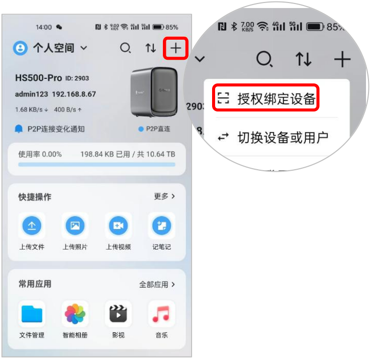 进入手机客户端APP首页,点击右上角“+”图标,再点击“授权绑定设备”进行扫码。