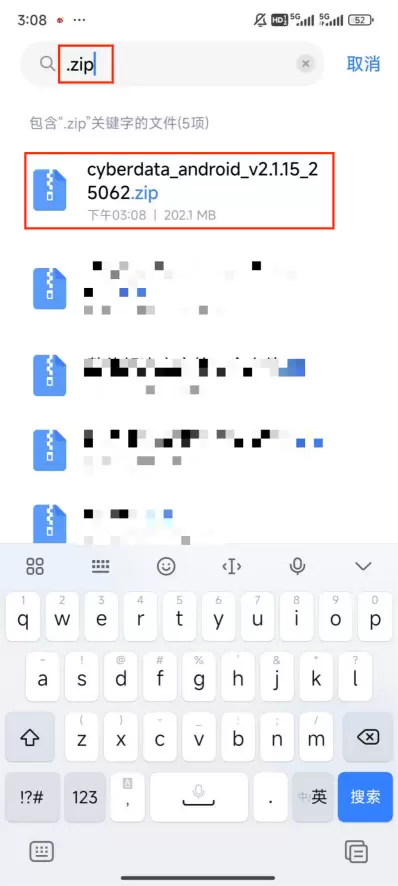 5、修改完成后点击搜索框搜索“.apk”,找到下载的赛博云安装包,点击安装