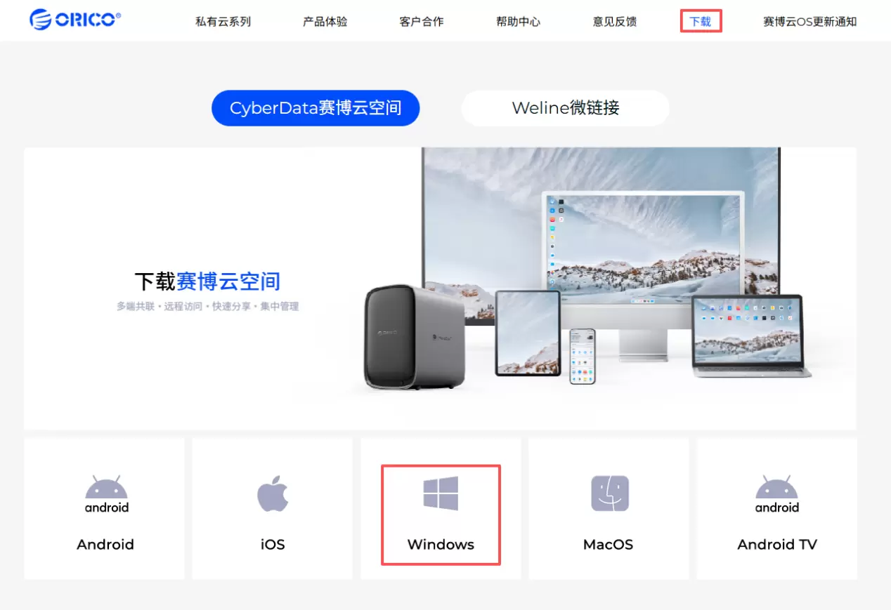 以ORICO官网PC端下载Windows系统的赛博云空间安装包为例。