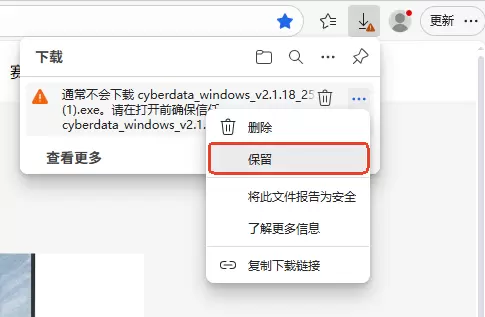 在 PC 端下载赛博云空间应用时,若您发现浏览器下载任务栏中出现红色感叹号标识、下载进程暂止,无需担忧,此为正常现象。