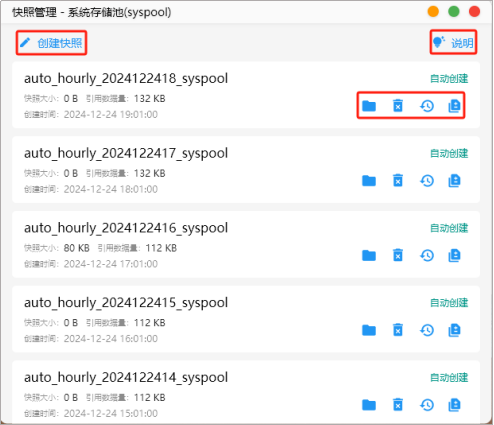 可以点击右上角的“说明”来查看快照功能的描述,也可以点击单个快照右下角图标来进行管理。