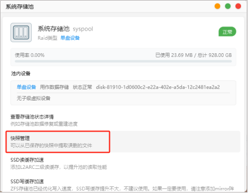 进到存储池的管理界面后,点击“快照管理”打开快照的管理界面。