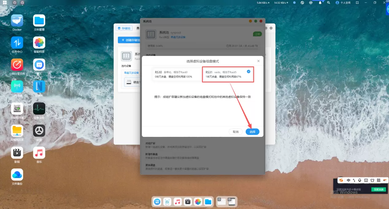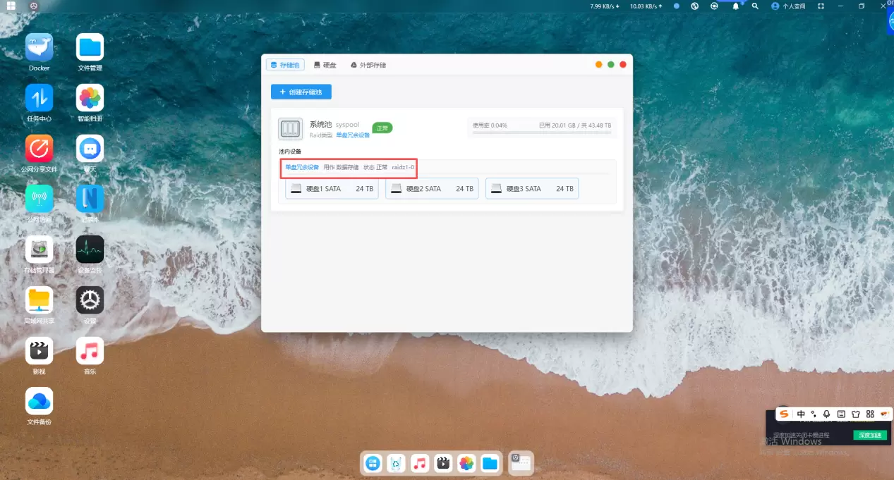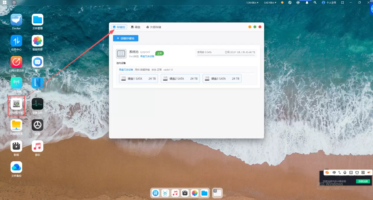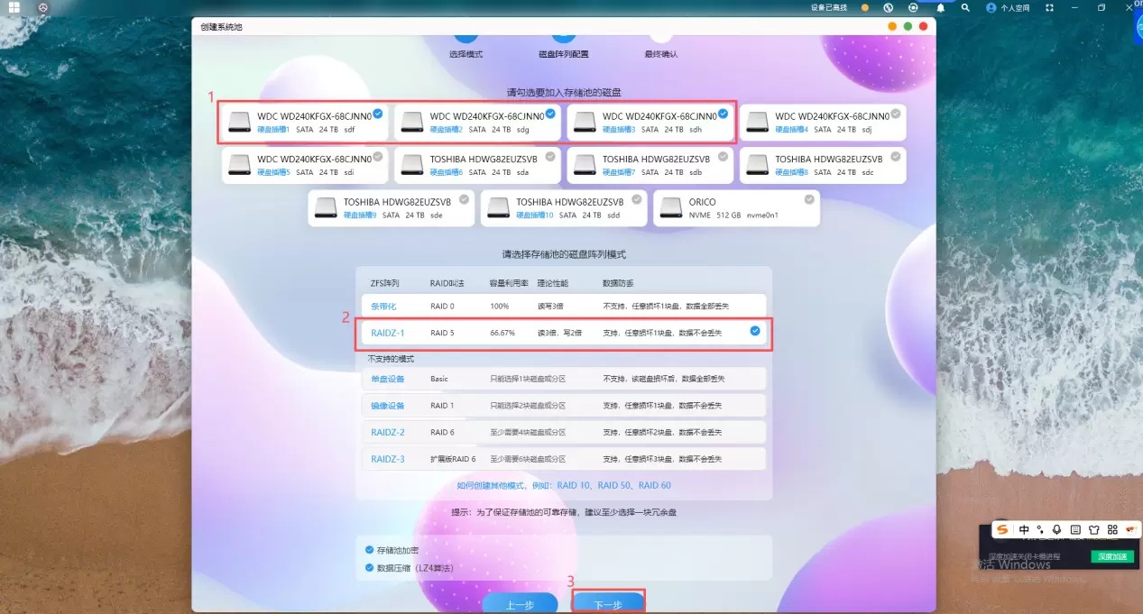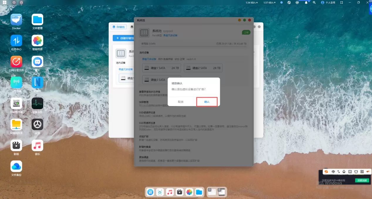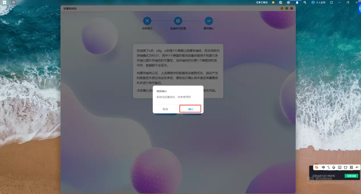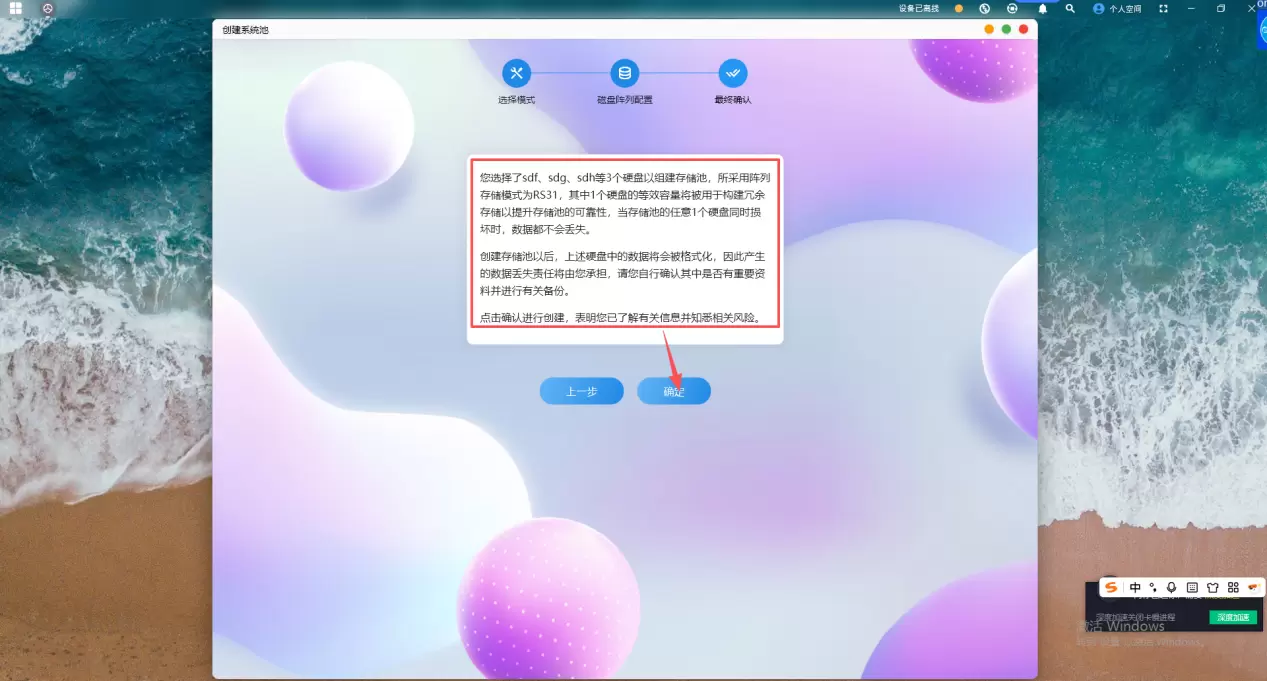 注意:创建存储池会格式化硬盘,清空硬盘里的数据,有重要数据请先备份