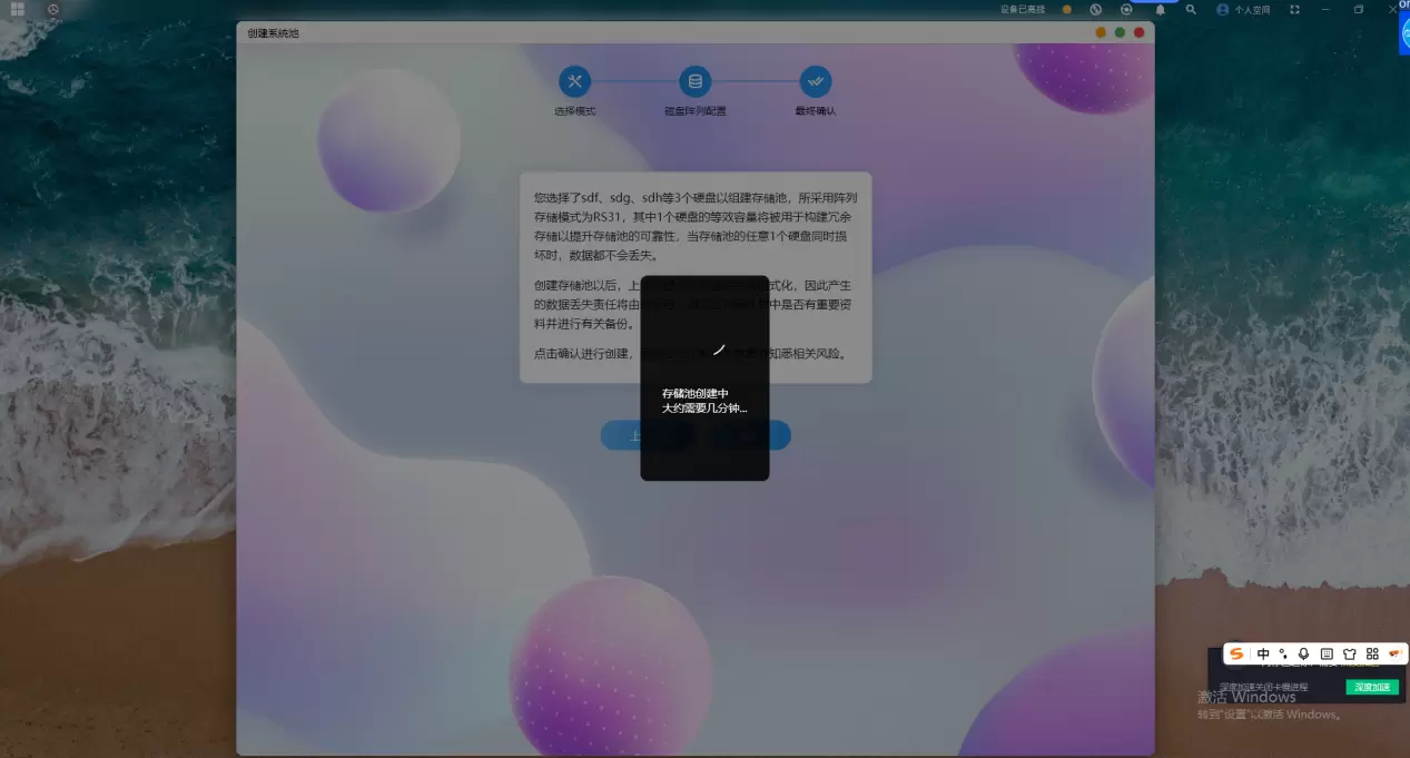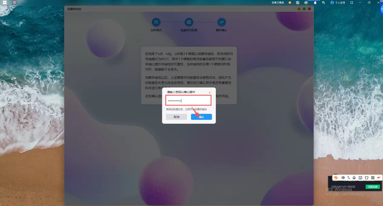 3、输入密码点击确认后会显示存储池创建中,这里需要等待一会