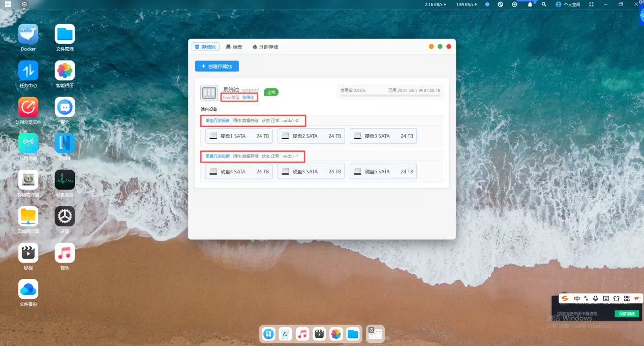 5、系统池创建成功后,点击左侧“存储管理器”-“存储池”,可以看到raid类型和容量使用情况等信息。