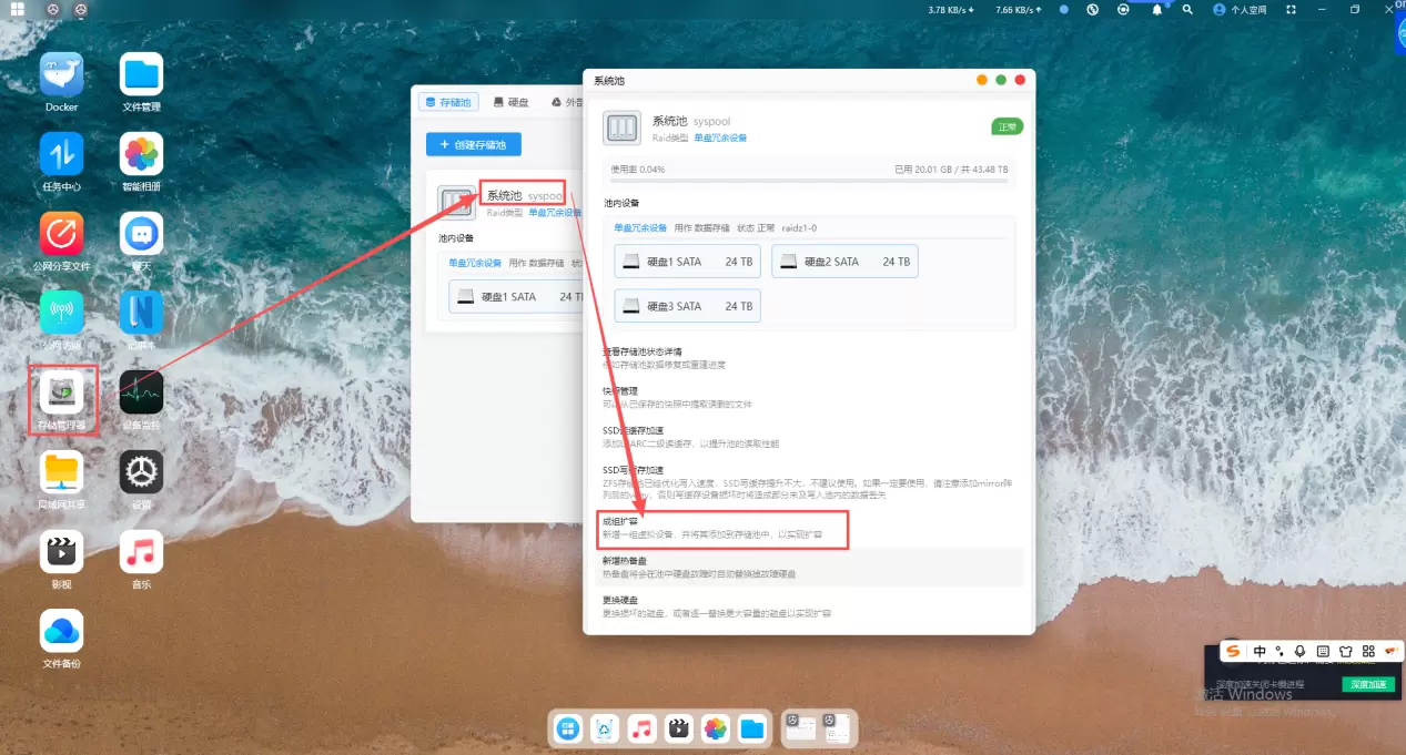 1、存储池创建为RAIDZ-1模式后点击“存储管理器”-“存储池”-点击“系统池”找到成组扩容选项