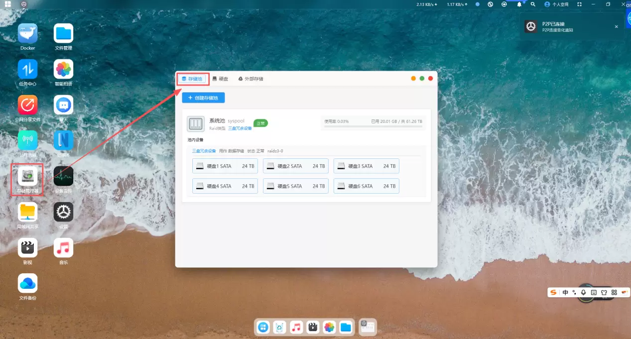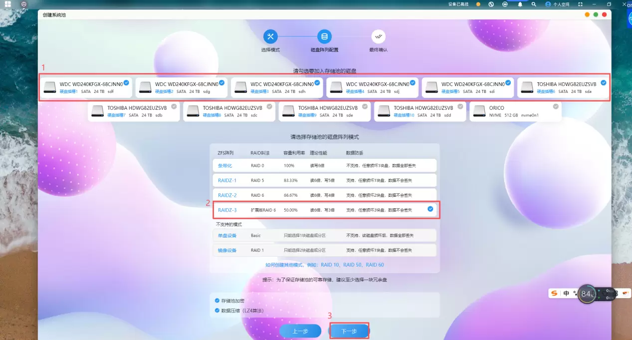 注意:创建存储池会格式化硬盘,清空硬盘里的数据,有重要数据请先备份