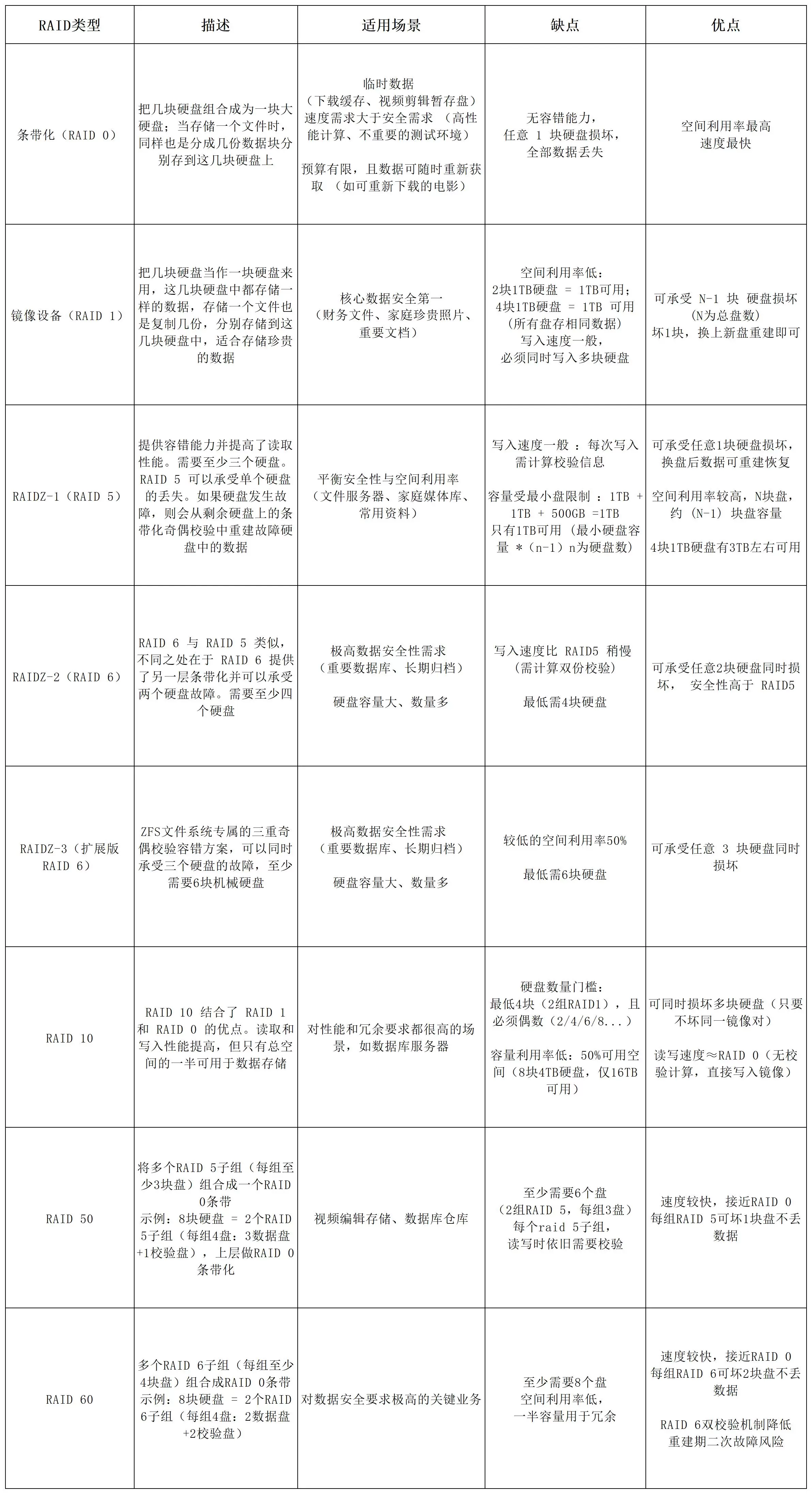 以下还有ZFS RAID 类型的详细分类:RAID-Z1、RAID-Z2 和 RAID-Z3。