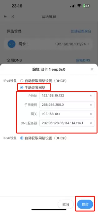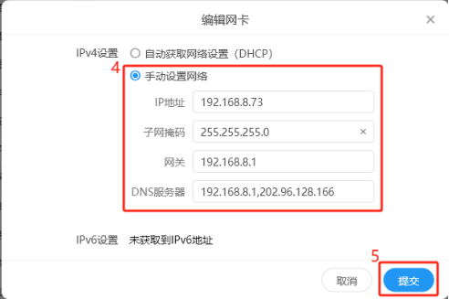 点击“手动设置网络”后,默认会加载自动获取到的IP地址信息,一般来说只需要更改IP地址即可,其他信息无需更改。修改完成后点击“提交”生效。
