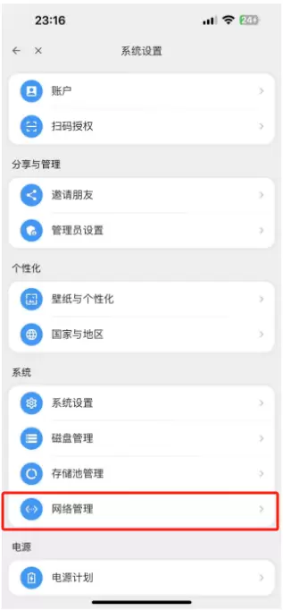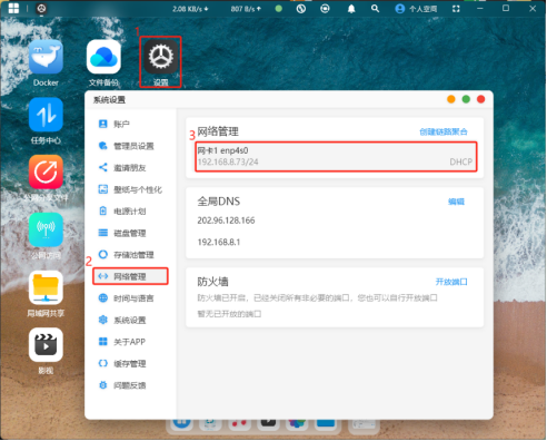 点击首页的“设置”,选择“网络管理”,进到网络管理界面,点击需要固定IP的网卡。