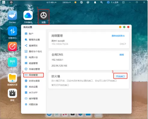 1. 进入网络管理界面 点击首页的“设置”,选择“网络管理”,进到网络管理界面,可以点击防火墙下的“开放端口”自定义对外端口。