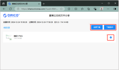 浏览器输入链接后,选中文件再点击“下载选中”或者“全部下载”,完成链接文件下载。