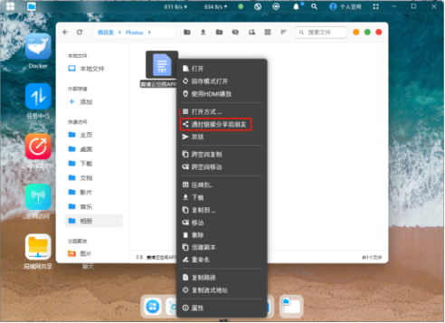电脑端鼠标右键选中需要分享的文件,点击“通过链接分享给朋友”,选择有效期,即可粘贴链接,分享给他人。