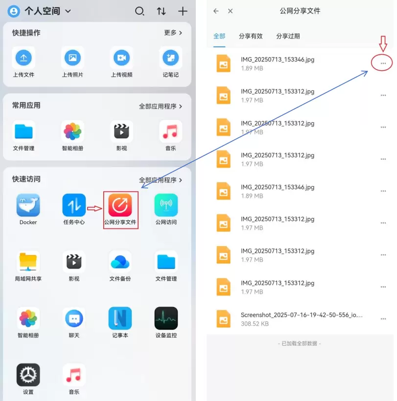 可在首页点击“公网分享文件”应用,打开之后即可看到之前分享过的文件。