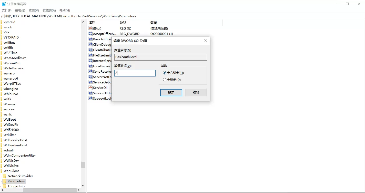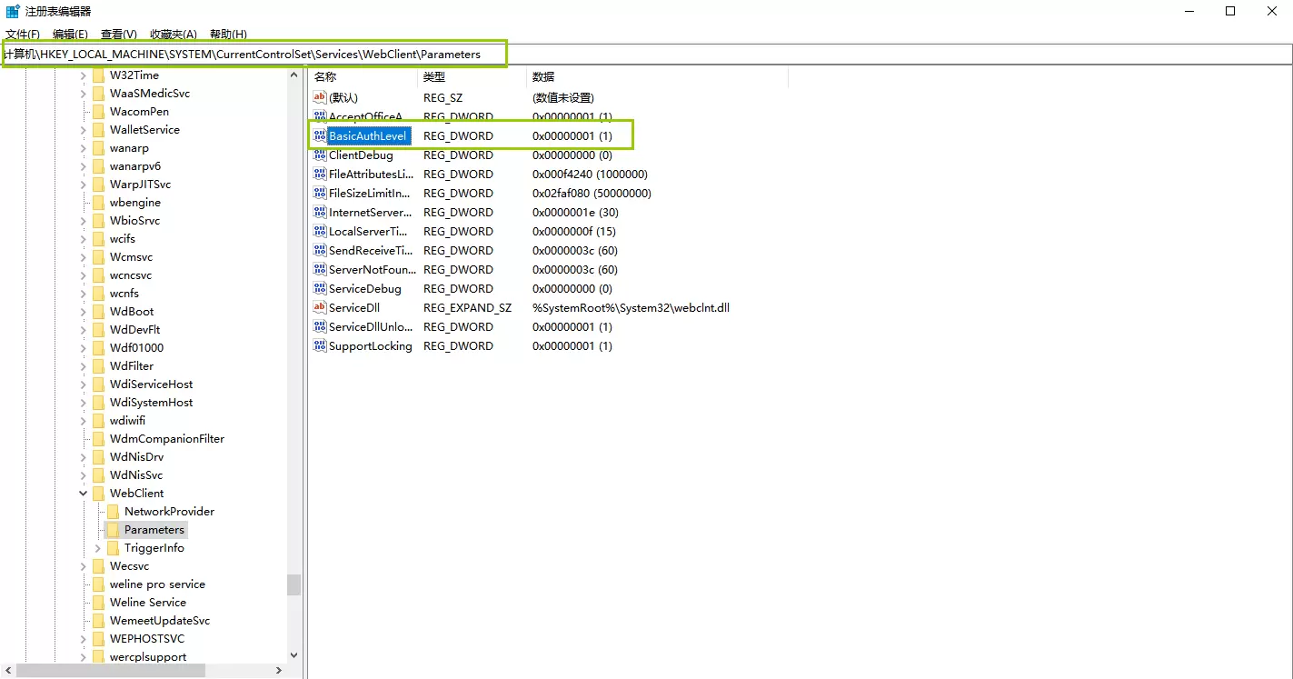 计算机\HKEY_LOCAL_MACHINE\SYSTEM\CurrentControlSet\Services\WebClient\Parameters